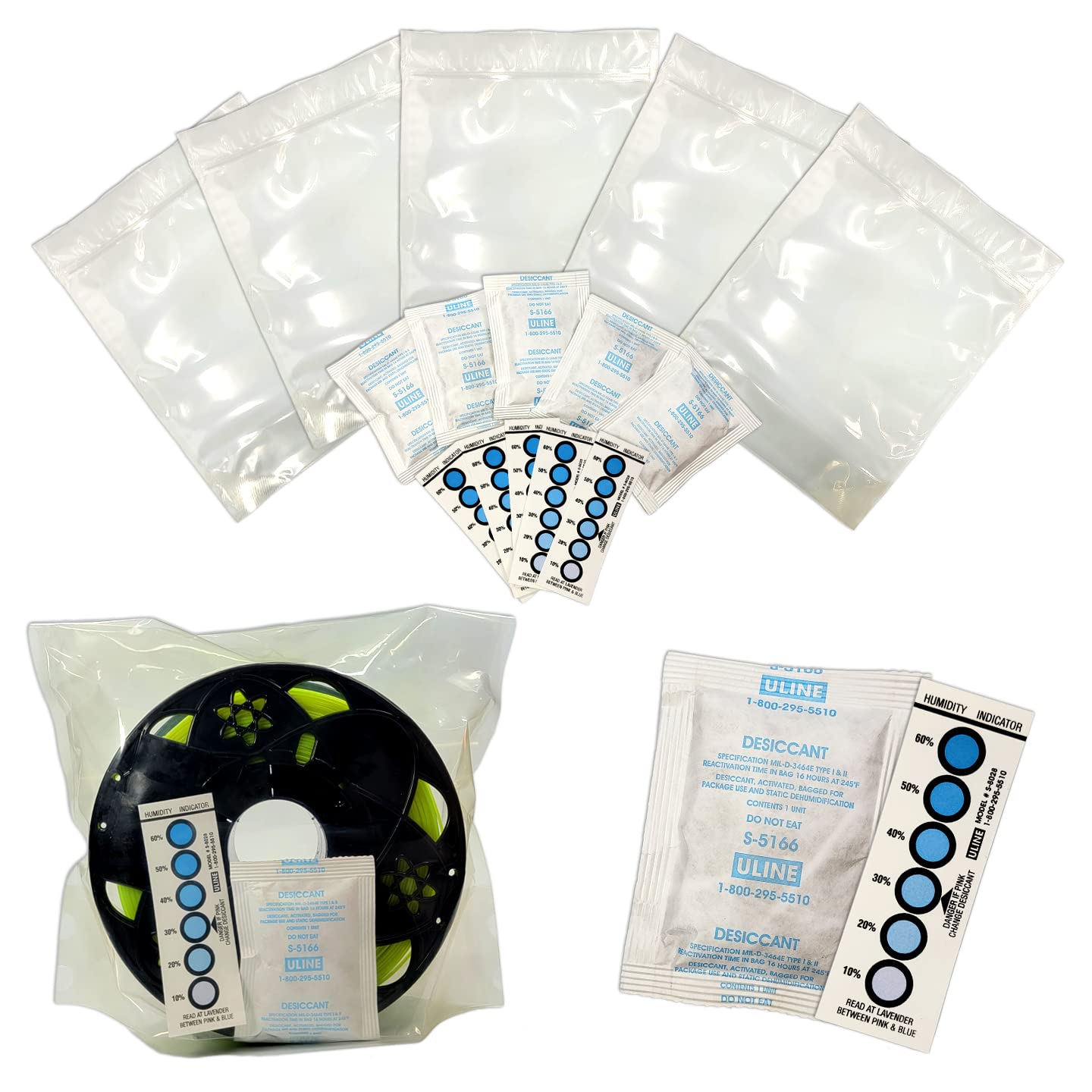 3D Printer Filament Storage Bags (Pack of 5): 5 Resealable 5 Mil Nylon/Plastic, 5 Large Oversize Rechargeable Clay Desiccant Drying Packs, 5 Humidity Indicator Cards by NetSellsIt