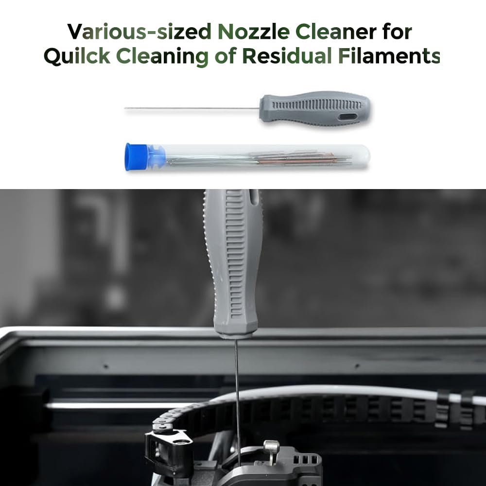 - 【Nozzle Cleaning Set】The Nozzle Cleaning Set consists of 10 pieces of various 0.38mm needles, an efficient 15mm nozzle cleaner, and a metal cleaning brush—all designed to effectively eliminate debris and residue from the nozzles of your 3D printer and other hard-to-reach areas. The L-shaped hexagonal wrench tool is included for the purpose of removing nozzles with ease. Additionally, both bent and straight tweezers are provided to facilitate the removal of silicone caps and the clearing of excess filament from nozzles.