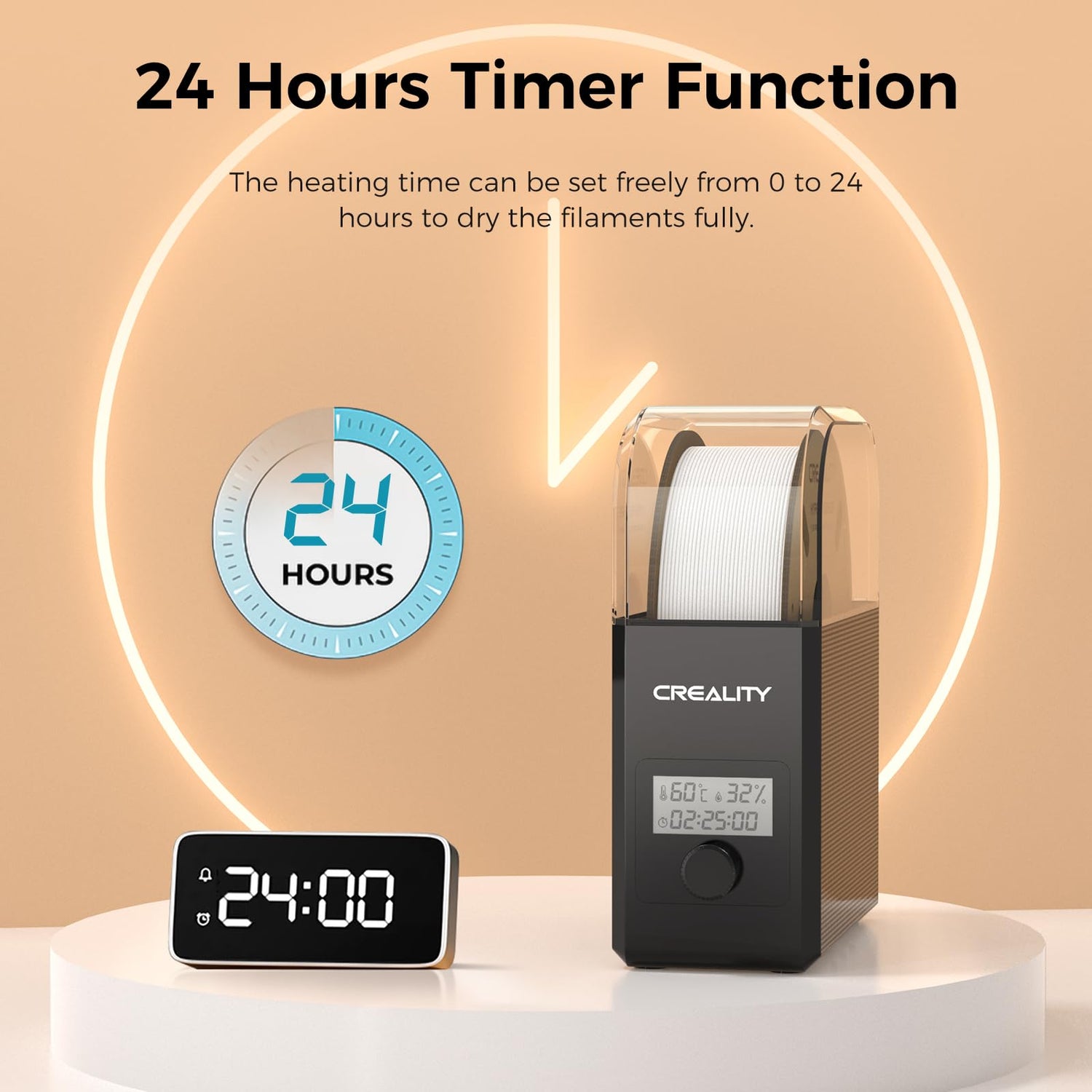 - Personalized Drying Time: Creality 3D Printer Filament Dry Box's heating time can be set freely from 0 to 24 hours to dry the filaments fully. Commonly used 3D filament on the market under normal circumstances only need 3-6 hours of drying to achieve a good printing experience and printing effect