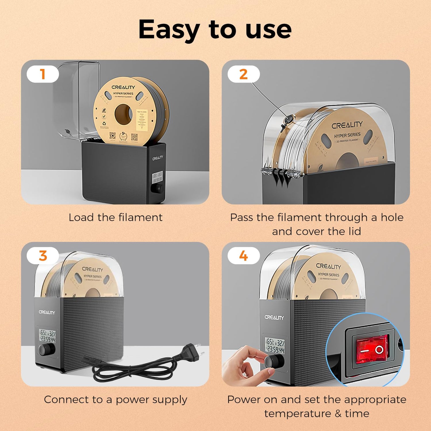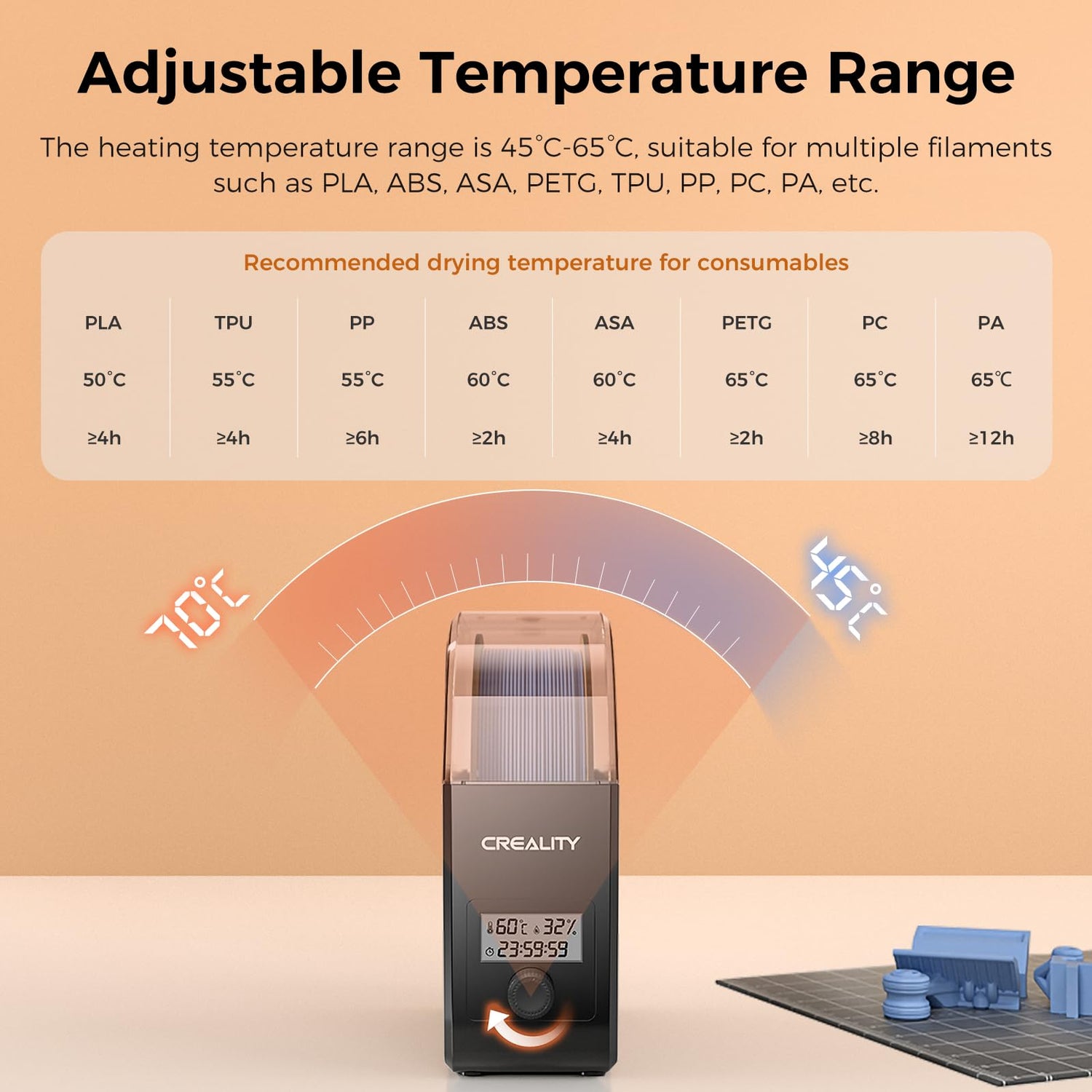 - Upgraded 360° Heating PLA Dryer with Fan: Creality filament box is designed of a built-in fan, so the air in the filament dryer can circulate. The fan makes the filament heat more evenly which can achieve all-round surrounding heating and rapid drying. Capable of reaching 65℃ in just 15 minutes