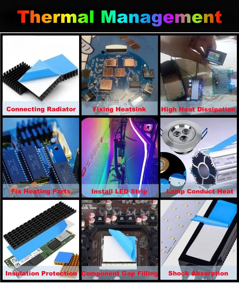 - Thermal Management: This double sides tape minimizes the impact of heat on the performance and longevity of components. It can be employed to attach heat sinks to chips, CPU, GPU, HDD, SSD drive, hard disk, cooler, module, transistors, and other heat-generating components in computers, laptops, servers, and gaming consoles. Additionally, it is suitable for LED lighting fixtures, power supplies, circuit boards, 3D printers, and other electronic devices where efficient heat dissipation is crucial.