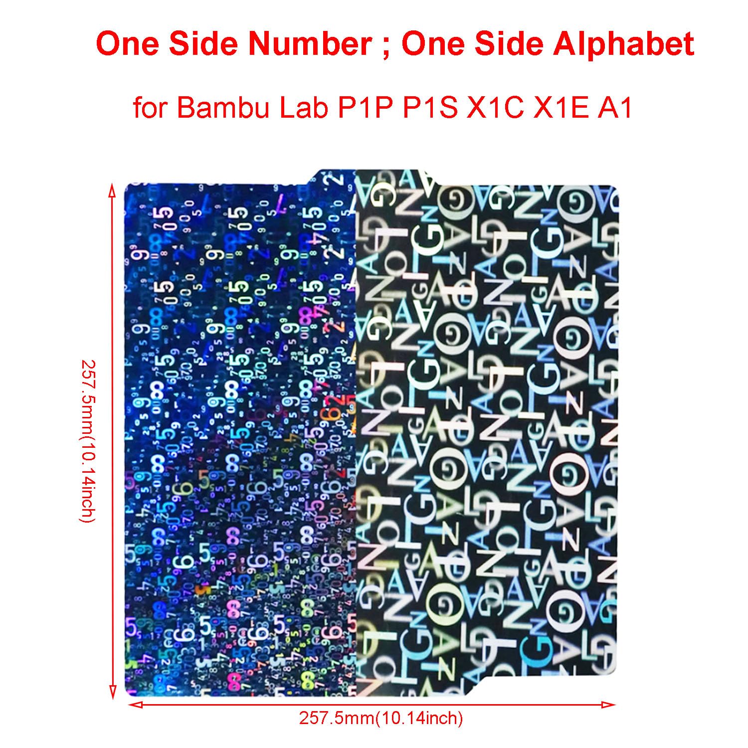 HzdaDeve Double Sided Build Plate 257.5x257.5MM Spring Steel Flexible Platform Print Bed Light Beam H1H Phantom Heated Board for Bambu Lab X1/X1C/X1E/P1P/P1S/A1 3D Printer (Alphabet+Number)