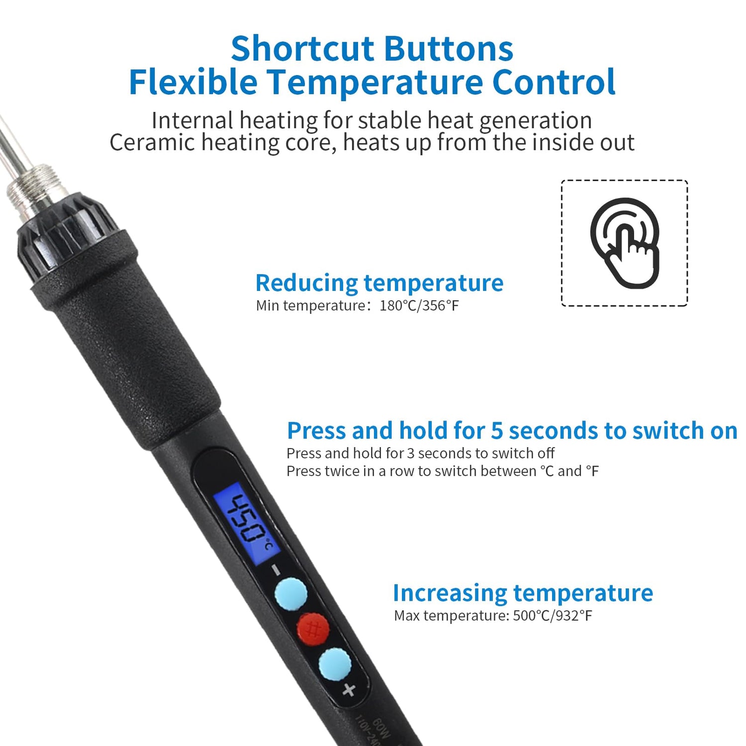 - 3. Soldering iron: Power:110v60w, Min Temperature: 180℃/356°F, Max Temperature500℃/932°F, Highly durable, Not prone to oxidation, heating up fast but controlled
