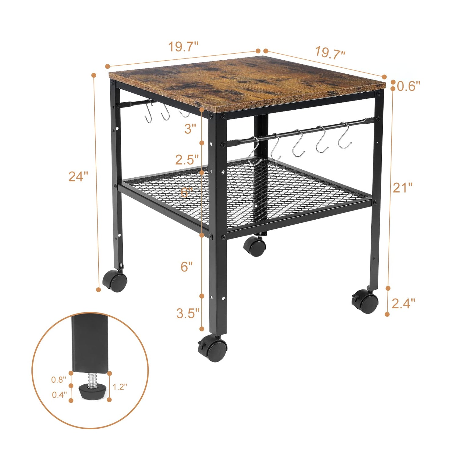- SPECIFICATIONS: Table made of MDF board and solid metal frame, table size 19.7" x 19.7", with wheels height 24", maximum bearing capacity 143 lb, 4 swivel wheels, 4 adjustable leg pads, 2 iron bars with 10 hooks, assembly tools and instructions.