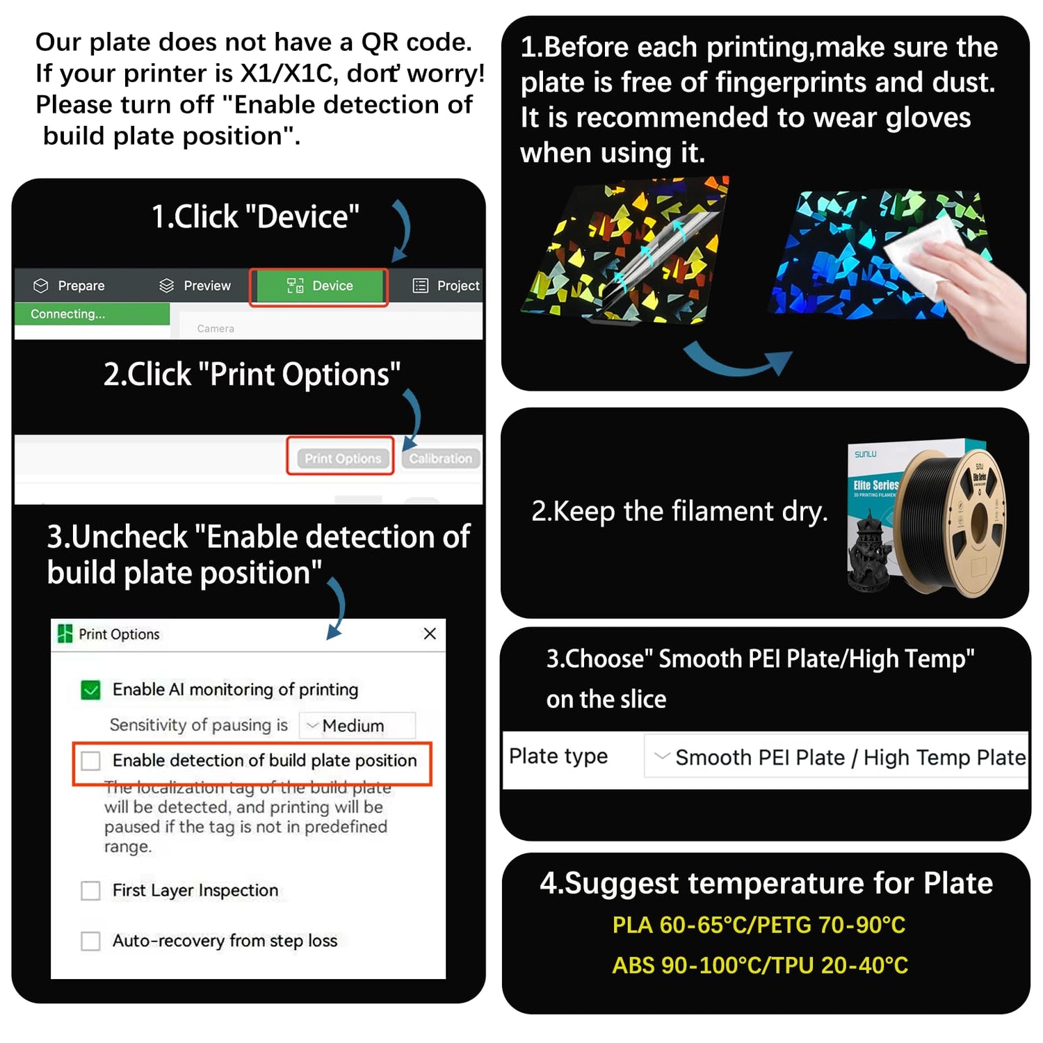 - 【Excellent Adhesion】Flake+Star build plate can withstand high temperature of 200 ° C.It is good to print PLA/PETG/ABS/TPU.The adhesion is more stronger than traditional build plate. If your printer is X1/X1C/X1E, please turn off "Enable detection of build plate position" before chosing the plate type.We recommend these filaments & temperatures for your H2H build plate "PLA: 60~65℃; PETG: 70-90℃";TPU:20-40°C;ABS:90-100°C.
