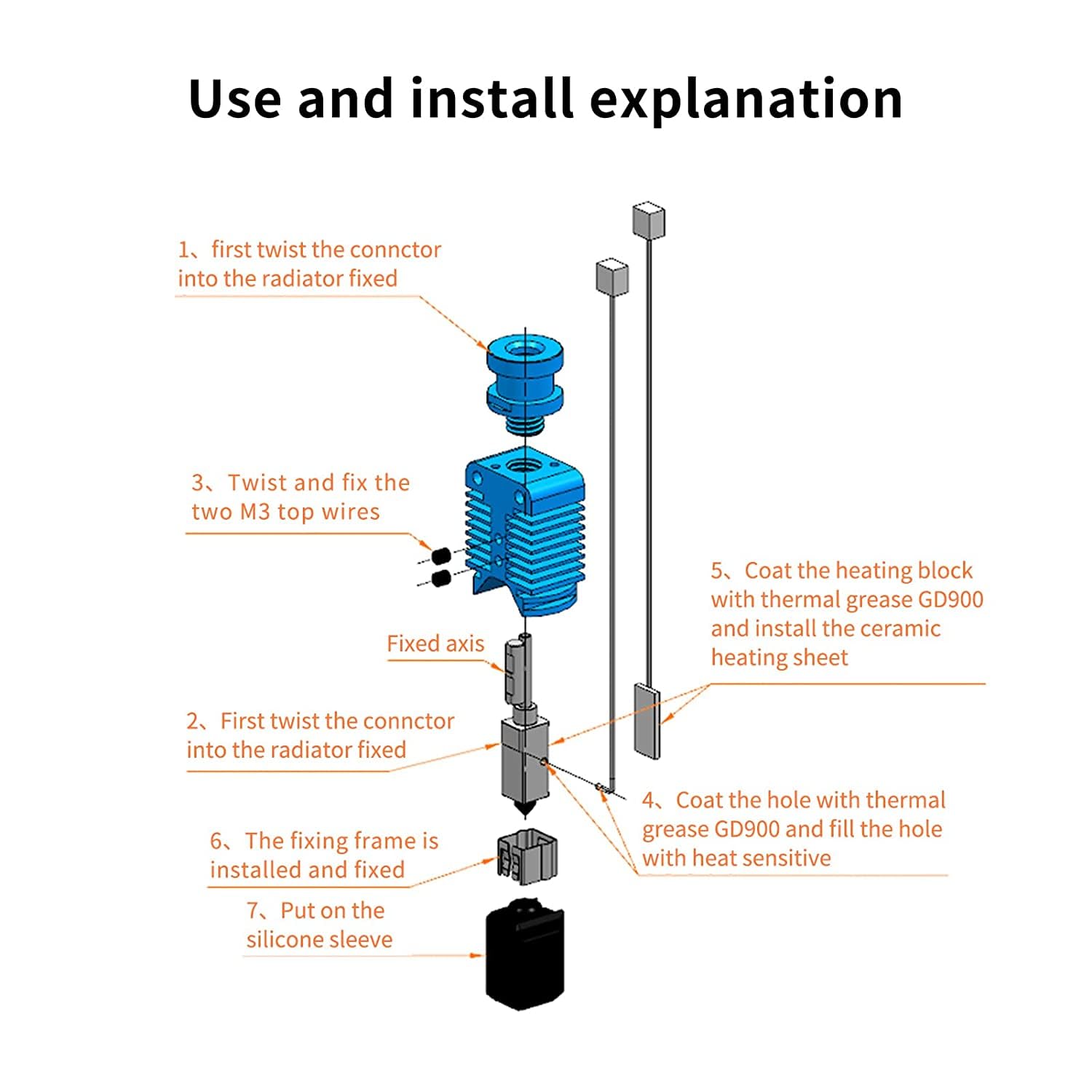 Details: Package: 1x heatsink, 1x integrated heater block tube with hardened steel nozzle 0.4mm. 1x ceramic heater ,1x thermistor, 1xsilicone cover(can reach 300C degree) and 2x cable extension,1set wrentch tools.