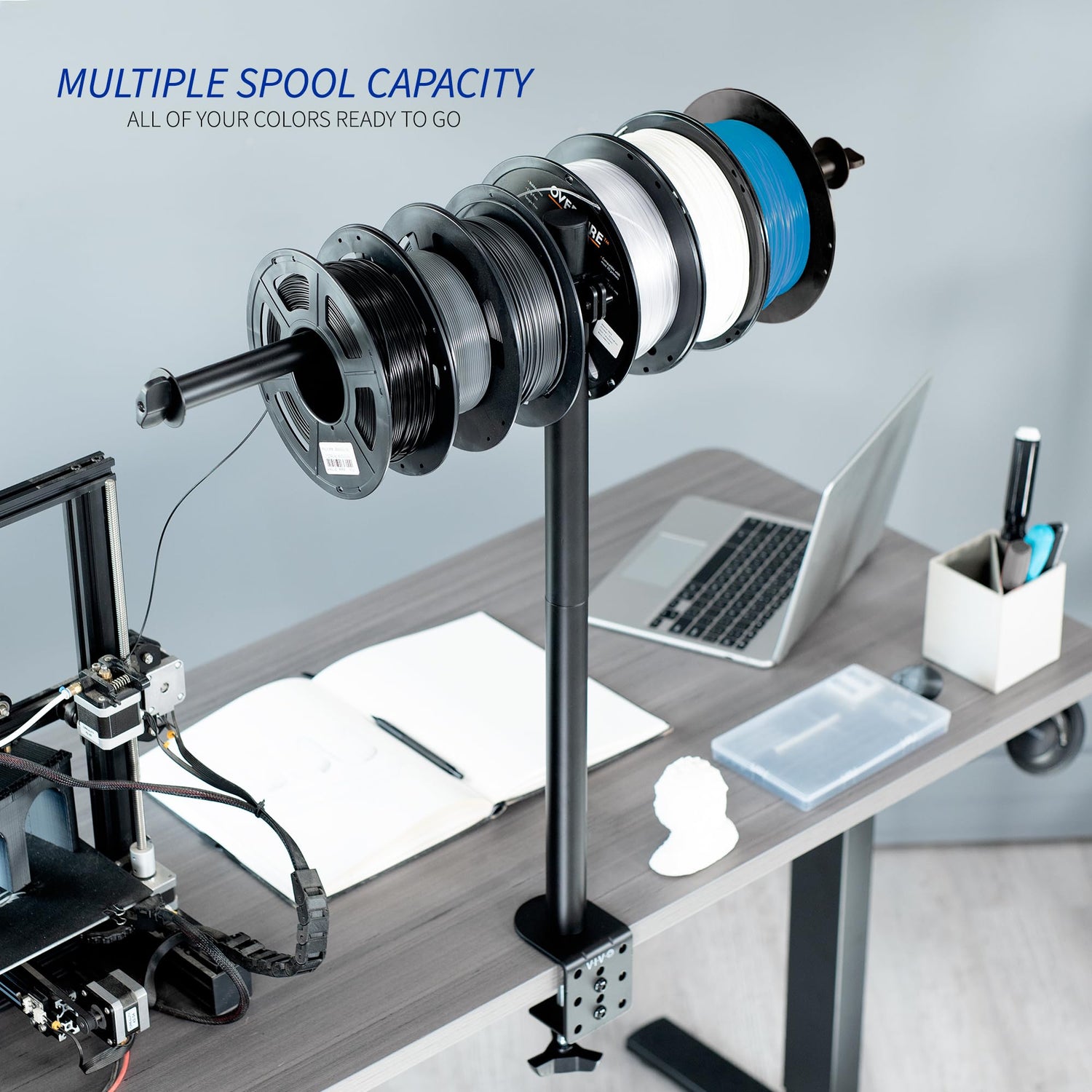 - Multi Reel Holder - Low profile clamp-on desktop spool holder supports multiple reels of different sizes directly behind or beside a 3D printer, keeping all the filaments needed for your print job ready and waiting.