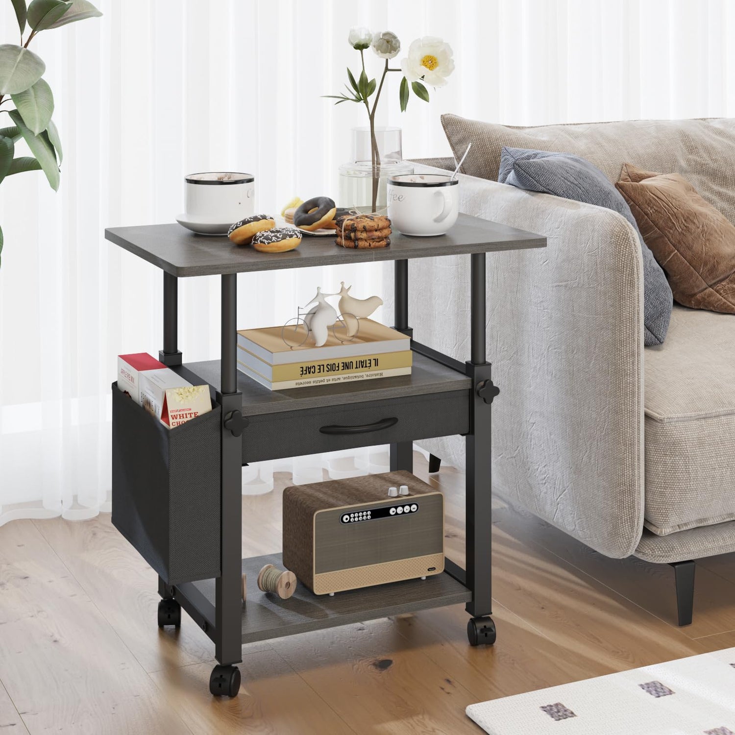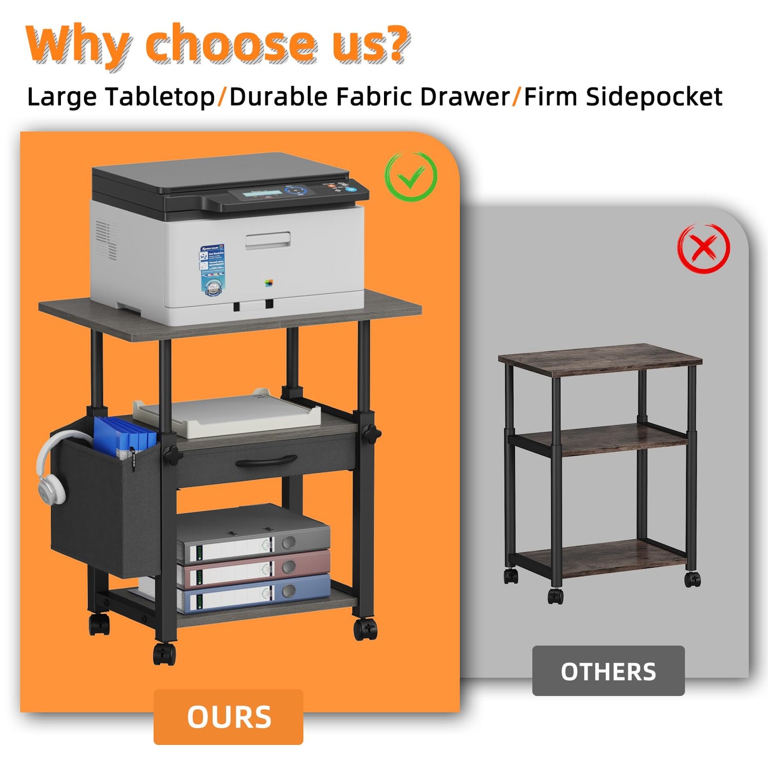 - 【3-Tier Height Adjustable Printer Table】Printer stand can set at different height position according to your demand. When not in use, you can set the lowest height to be a under stand printer stand. 3-Tier open shelves offer ample storage space for paper reams,file folder,ink cartridge and pen holder etc.