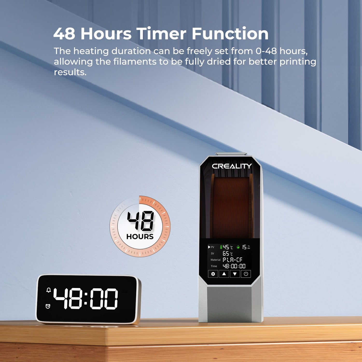 - 【48 Hours Timer Function,Real-time humidity & temperature monitoring】The heating duration can be freely set from 0-48 hours,allowing the filaments to be fully dried for better printing results.Keep your filaments dry and free from moisture for consistent high-quality prints.