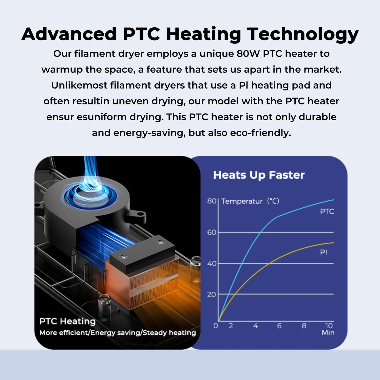 - 【360° Hot-air Fast Heating and Uniform Drying】Creality filament dryer employs a unique 80W PTC heater to warm up the space. The dryer quickly heats with a built-in fan, circulating hot air 360° for uniform heating, effectively drying moisture filaments and improving printing results. More durable, energy-saving, and eco-friendly. Dryer box input voltage: 110V 50/60Hz.