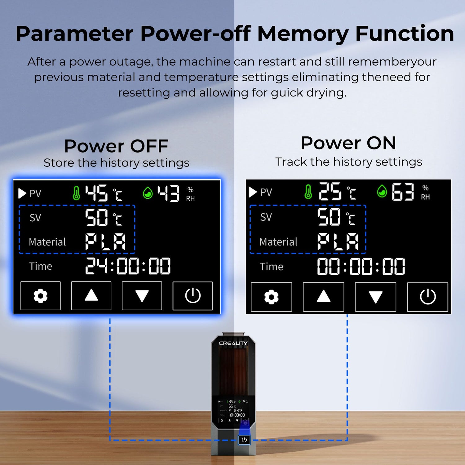 - 【Parameter Power-off Memory Function】After a power outage, the machine can restart and still remember your previous material and temperature settings, eliminating the need for resetting and allowing for quick drying. Say goodbye to the hassle of resetting your Filament Dryer after a power outage.