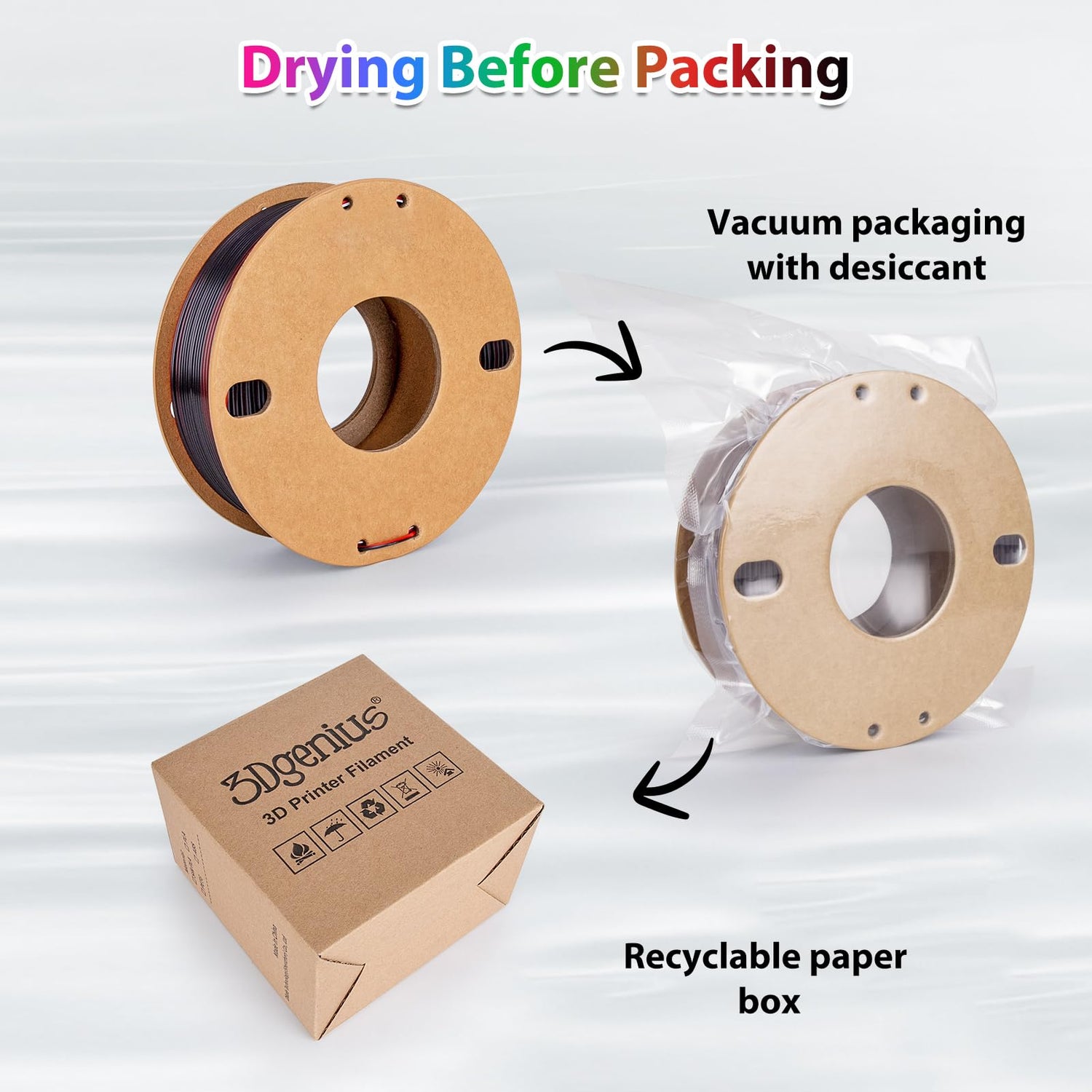 - NO CLOGGING & NO BUBBLE: 3Dgenius 3d printer filament PLA features 100% vacuumed package. The PLA filament pack completely dried for 24 hours before packaging and then vacuum sealed with desiccants to effectively protect the filament from moisture, no stringing and bubble-free. 3Dgenius PLA filament 1.75mm will give you a smoother and more stable printing experience.