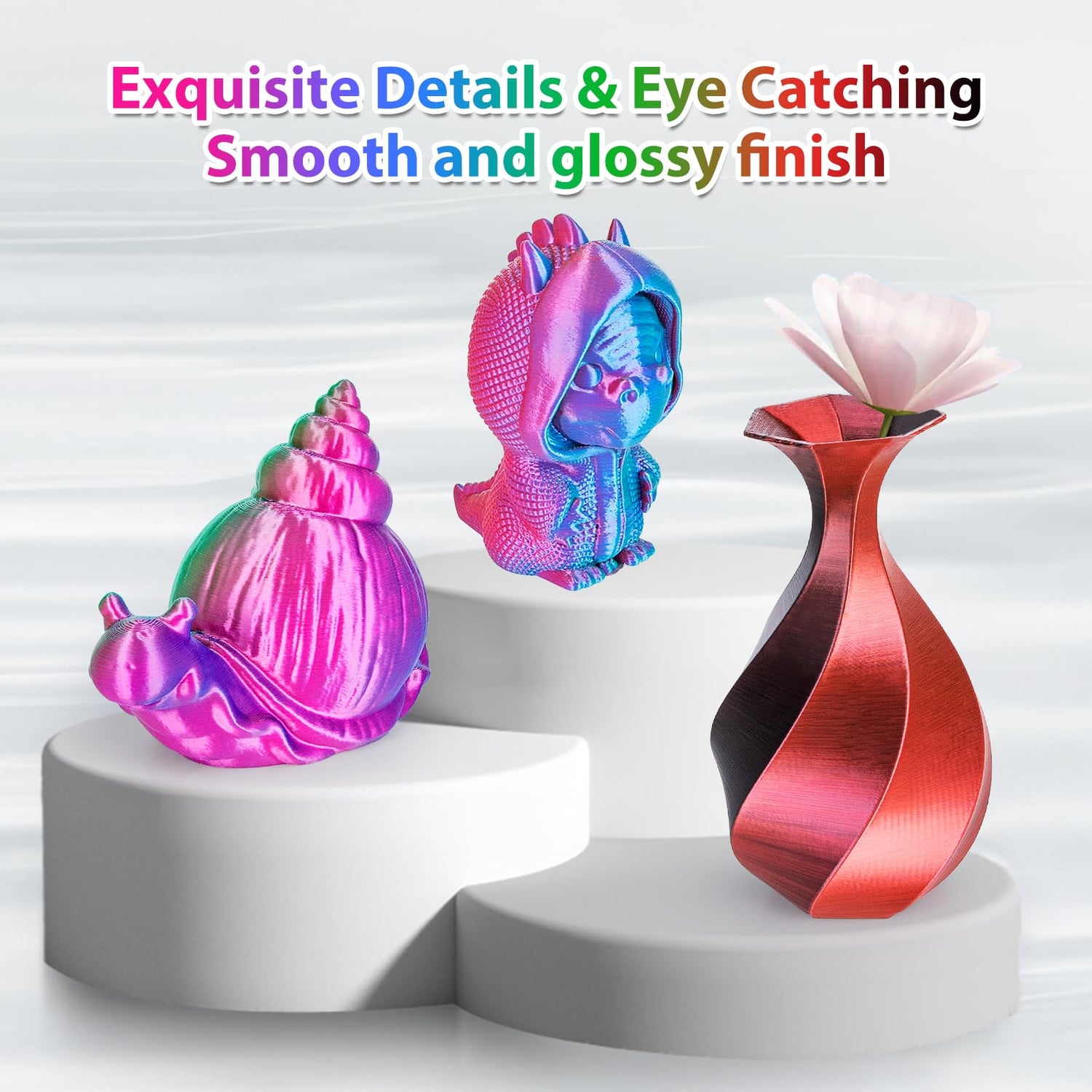 - 250G X 2 COLORS PACK: Comes with 2 different colors(rose red sky blue green, red black), you can create your 3d world with this silk multicolor PLA filament pack. Each color weighs 250g, providing a total of 500g.