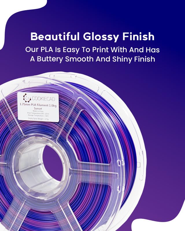 Details: We are really excited to introduce you to Cookiecad PLA filament in unique and interesting colors. This is Sunset - it has three beautiful colors on one spool! The color will change over time, so small objects will only contain one color. You can print multiple items at a time, large items or increase infill to get more of the color change into a single print. The colors will fade from dark blue, to purple, to pink and back to purple and dark blue. Every color in the transition is beautiful. Transision rolls are really fun to print with!