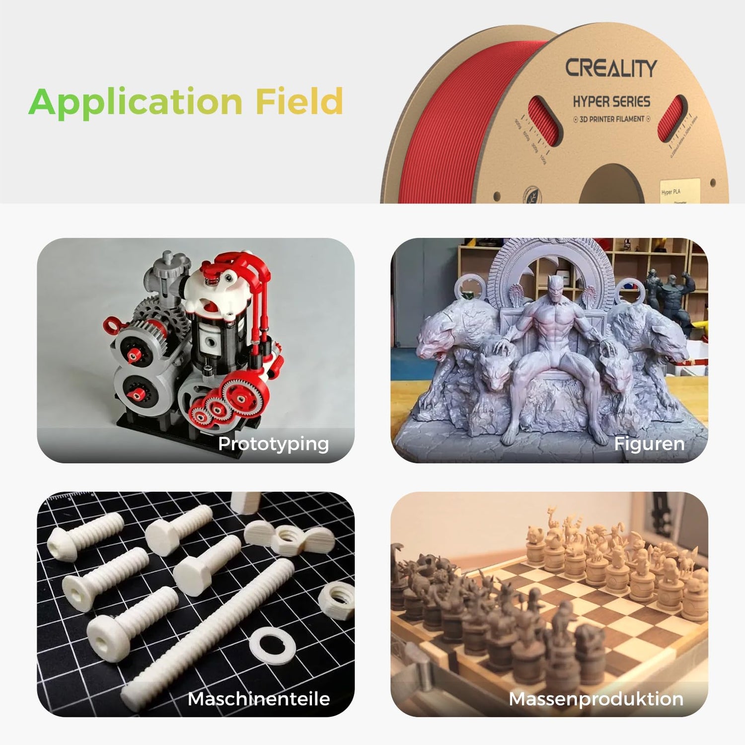 - 10x Faster Printing Hyper PLA, Speed Up Your Creativity: Hyper Series PLA supports up to 602mm/s print speed for the high fluidity and fast cooling formula. PLA filament's high fluidity provides sufficient melting and extrusion, while creality hyper pla's rapid cooling provides fast shaping for high-speed printing