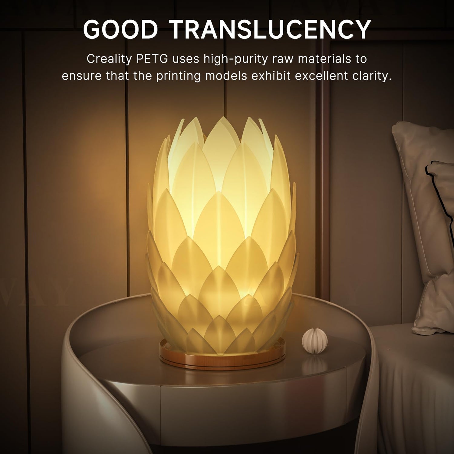 - 【Toughness-Enhanced PETG】 Creality PETG choose durable and strong material that delivers excellent clarity, light transmission, and a glossy finish. It is recommended to use a printing temperature of 220-250°C and a base plate temperature of 70-80°C for better printing results.