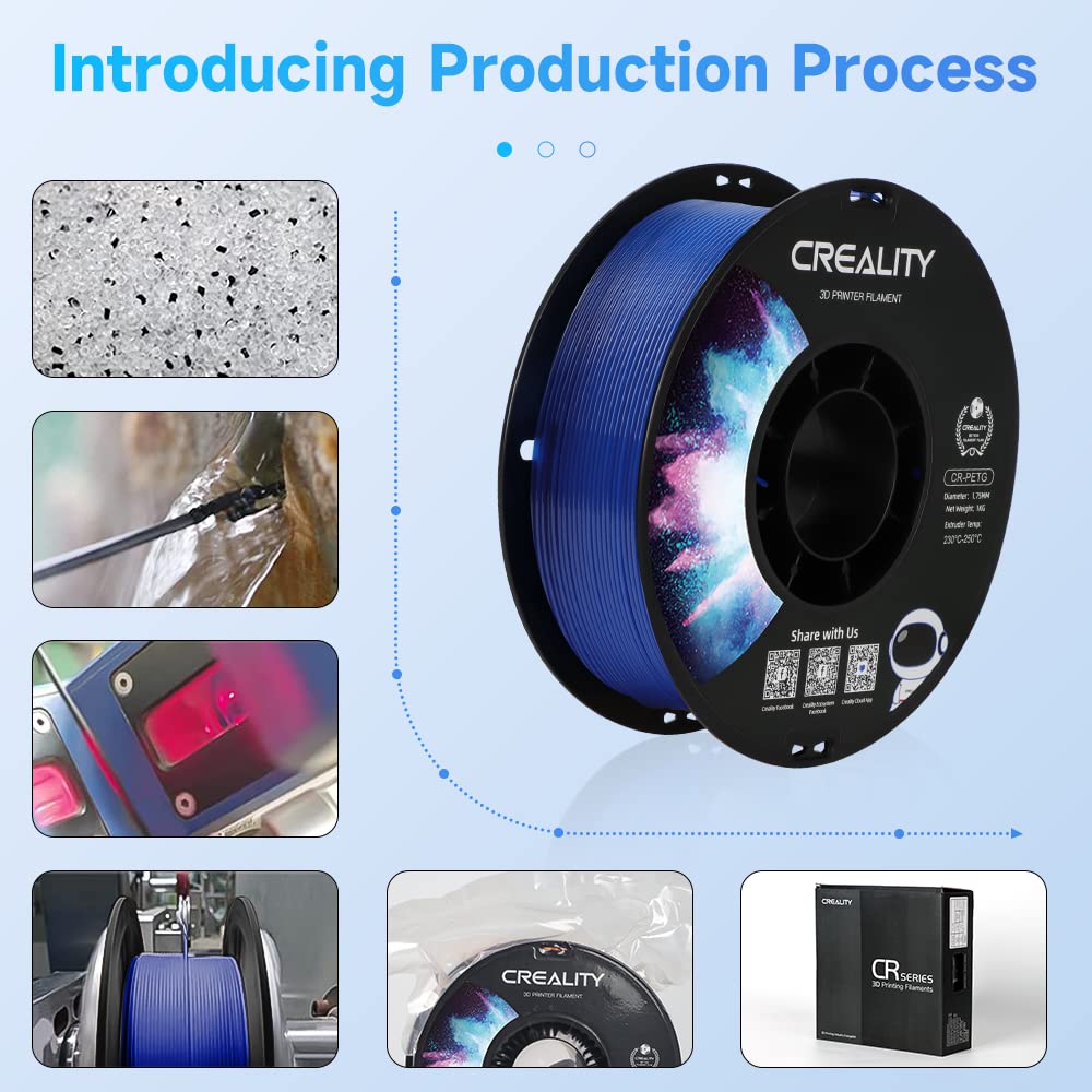 - Clog-Free & Bubble-Free: Creality CR-PETG filament is designed and manufactured with a clog-free patent to guarantee a smooth and stable printing experience with these PETG refills. Our PETG consumables are fully dried for 24 hours before packing, then vacuum sealed in PC bags with desiccant.