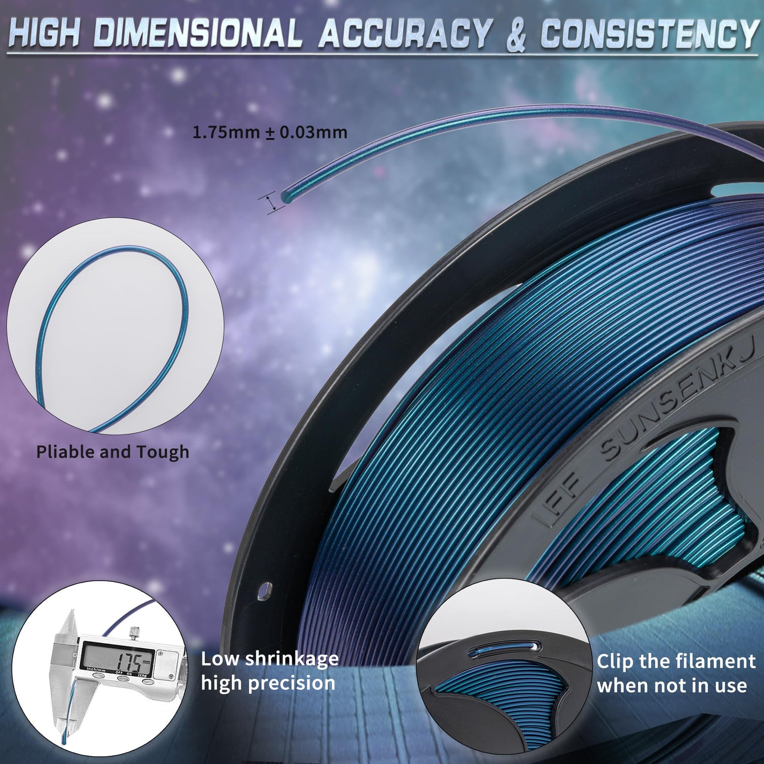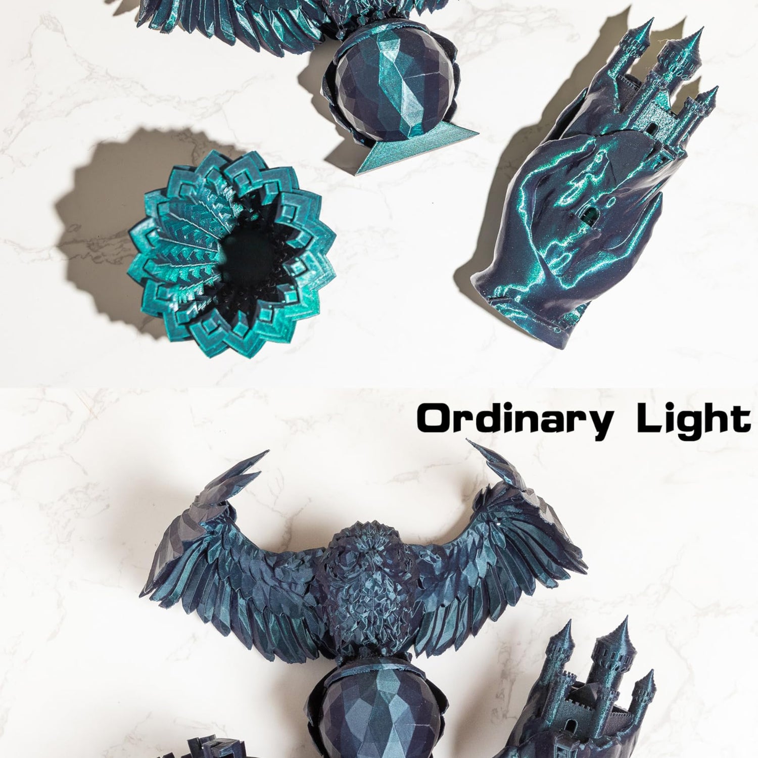 • 【Chameleon Color Change】This Chameleon_Royal Green includes: Dark Green, Dark Purple, Spark Blue and Mix. The diameter tolerance of the PLA fiber is 1.75mm +/-0.02mm! Non-turnover characteristics achieve certain output quality and stable printing. Bringing higher precision printing experience