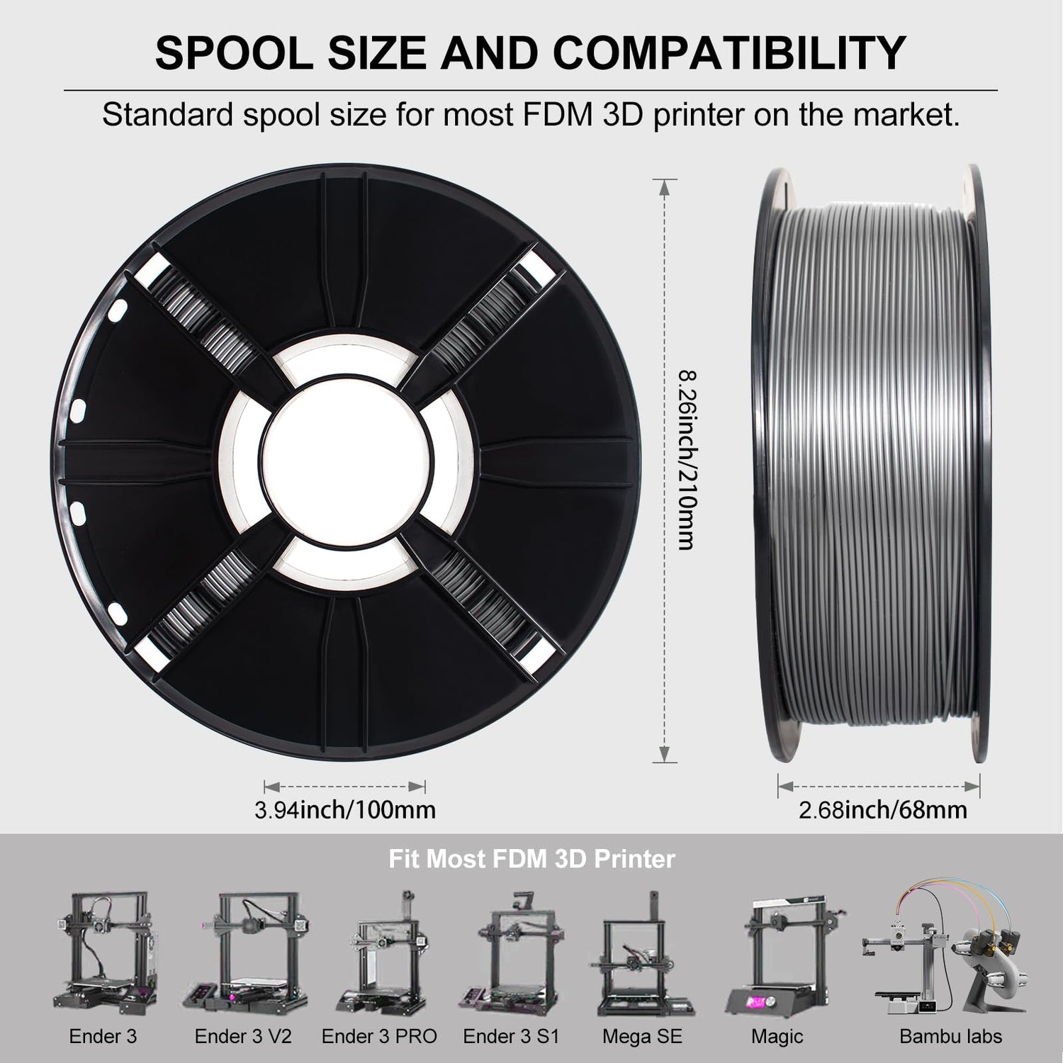 - 【Metallic Finish Color&High Quality】The special color of PETG Filament brings arts & crafts and 3D Projects Smooth Metallic Surface which definitely gives eye-catching, glossy prints.With no post polishing needed, you can instantly design prints with a dynamic metal-like finish.It's very suitable to print decoration or gift for all kinds of festival and cosplay.This filament Anti-warping, high accuracy, no bubble, no jamming and no drawing.