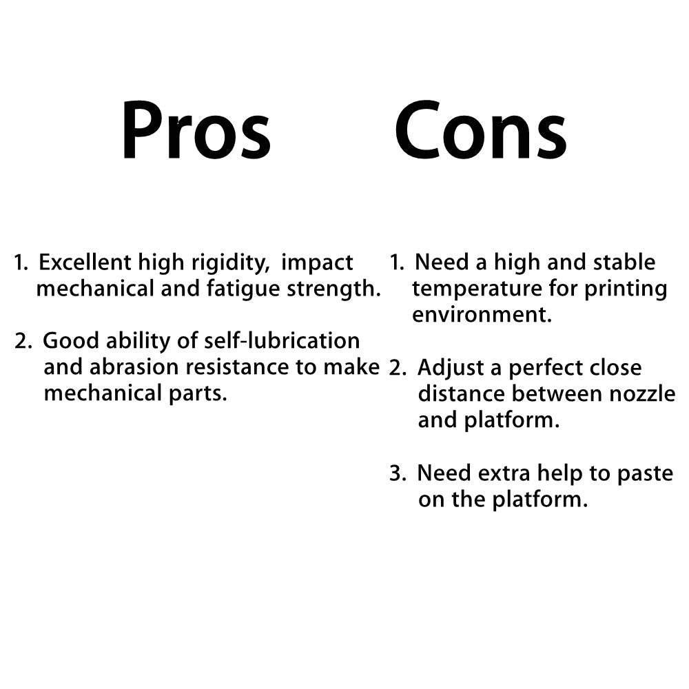 - About material, our pom filament has excellent toughness to print mechanical parts which need to be strong and tough like gear, screw and nut. There are less odor, less warping, no block and no bubble when doing printing.