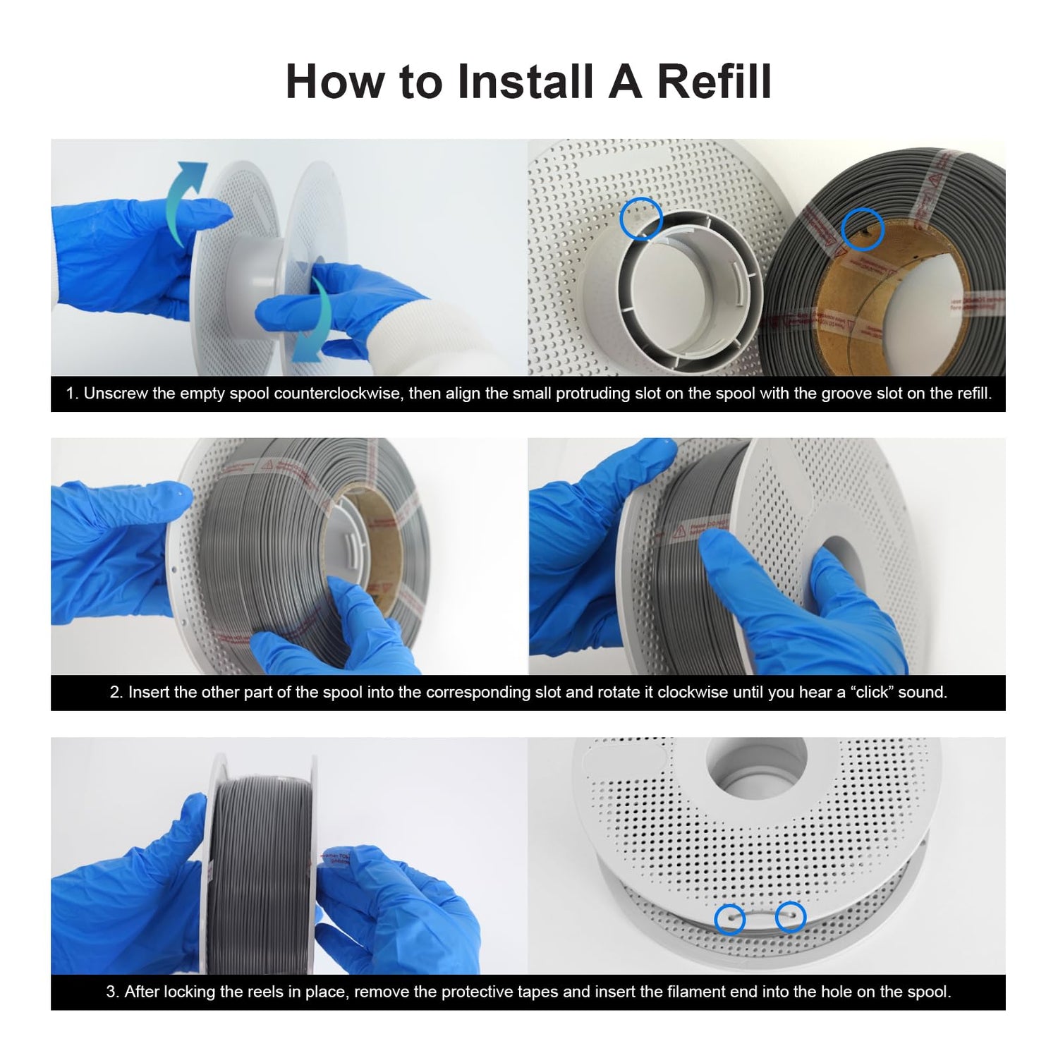 - [How to Replace A Refill] - Easy and quick installation: Align the refill slot with the empty spool slot and snap it into place, then align the slots of the 2 discs and rotate them until the 2 discs are firmly fixed together. NextShapes filaments are all equipped with vacuum bags and desiccant to prevent moisture.