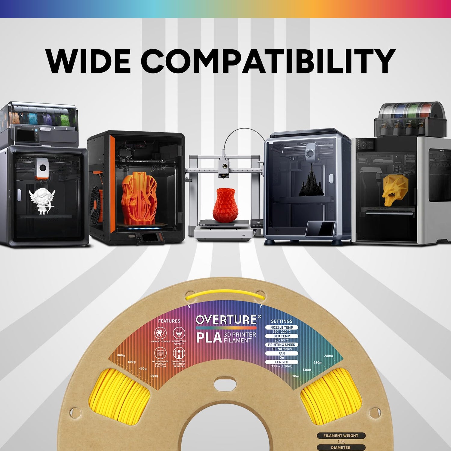 - 【Wide Compatibility and Color Selection】 Overture filaments seamlessly integrates with most consumer and industrial 3D printers. Explore your creative side with our extensive selection of vibrant colors, ensuring a spectrum of possibilities for your unique creations