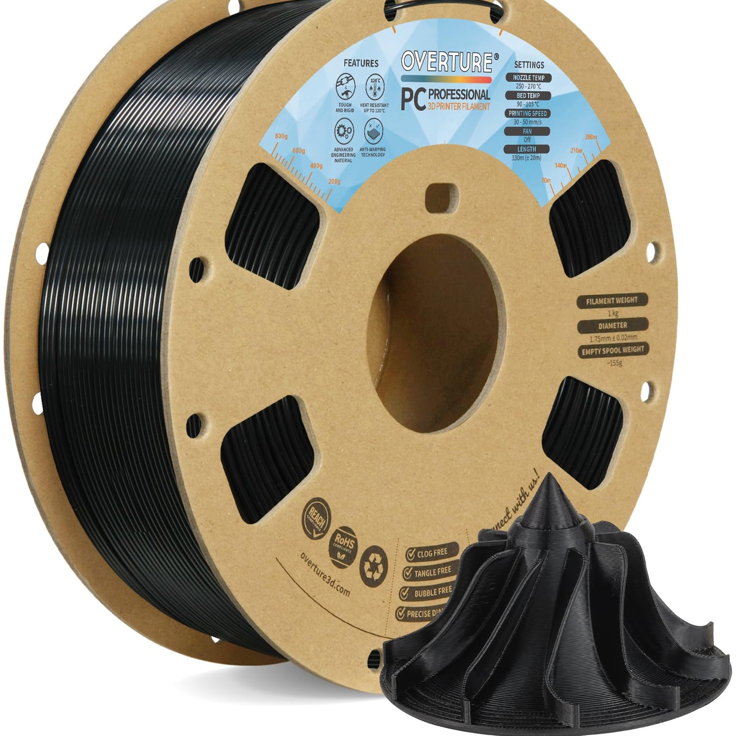 OVERTURE Tough PC Professional Filament, Cardboard Spool, 1kg(2.2lbs), Dimensional Accuracy Probability +/- 0.02mm, Fit Most FDM Printer (Black)