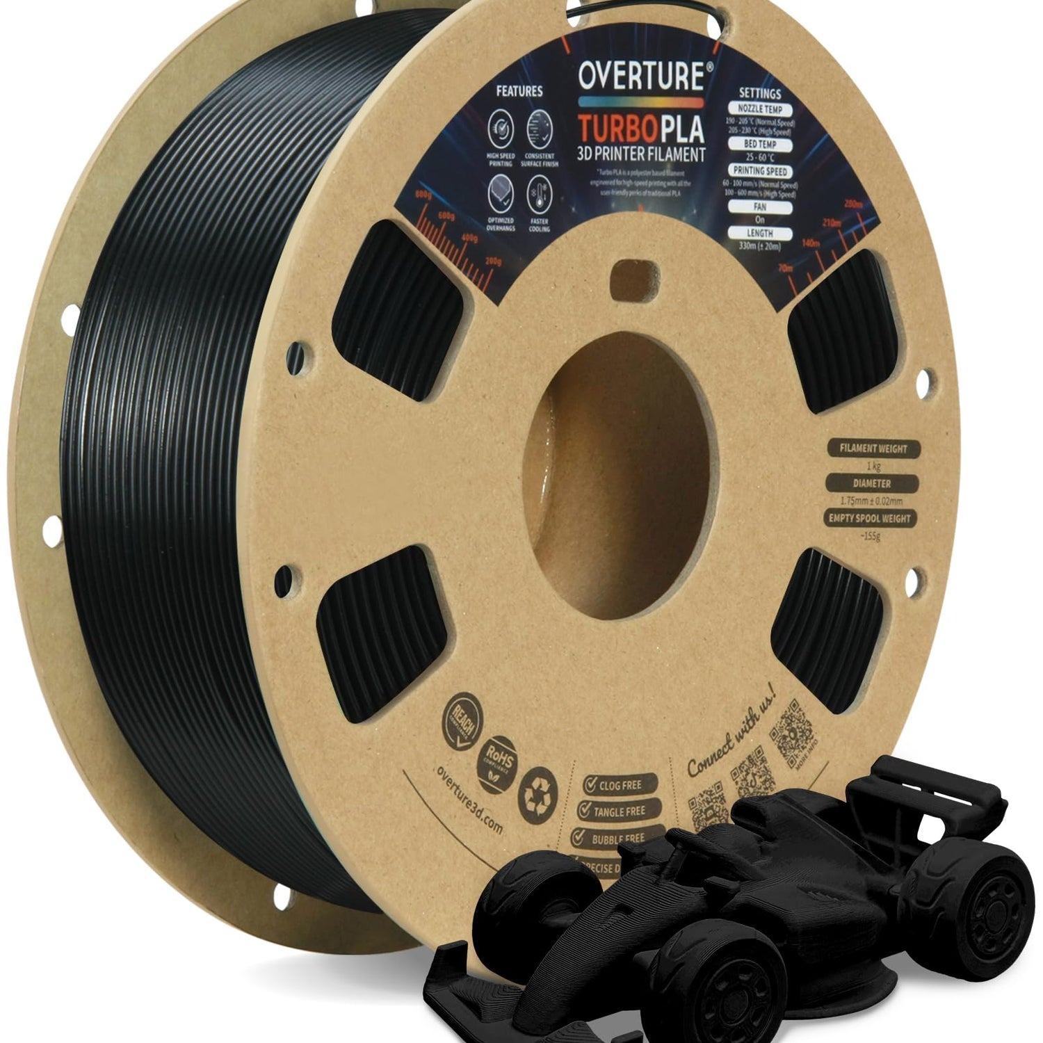 OVERTURE Turbo PLA Filament 1.75mm Rapid PLA Filament High Speed 600mm/s, 1KG Cardboard Spool (2.2lbs), Dimensional Accuracy +/- 0.02mm, Fit Most FDM Printer(Black)