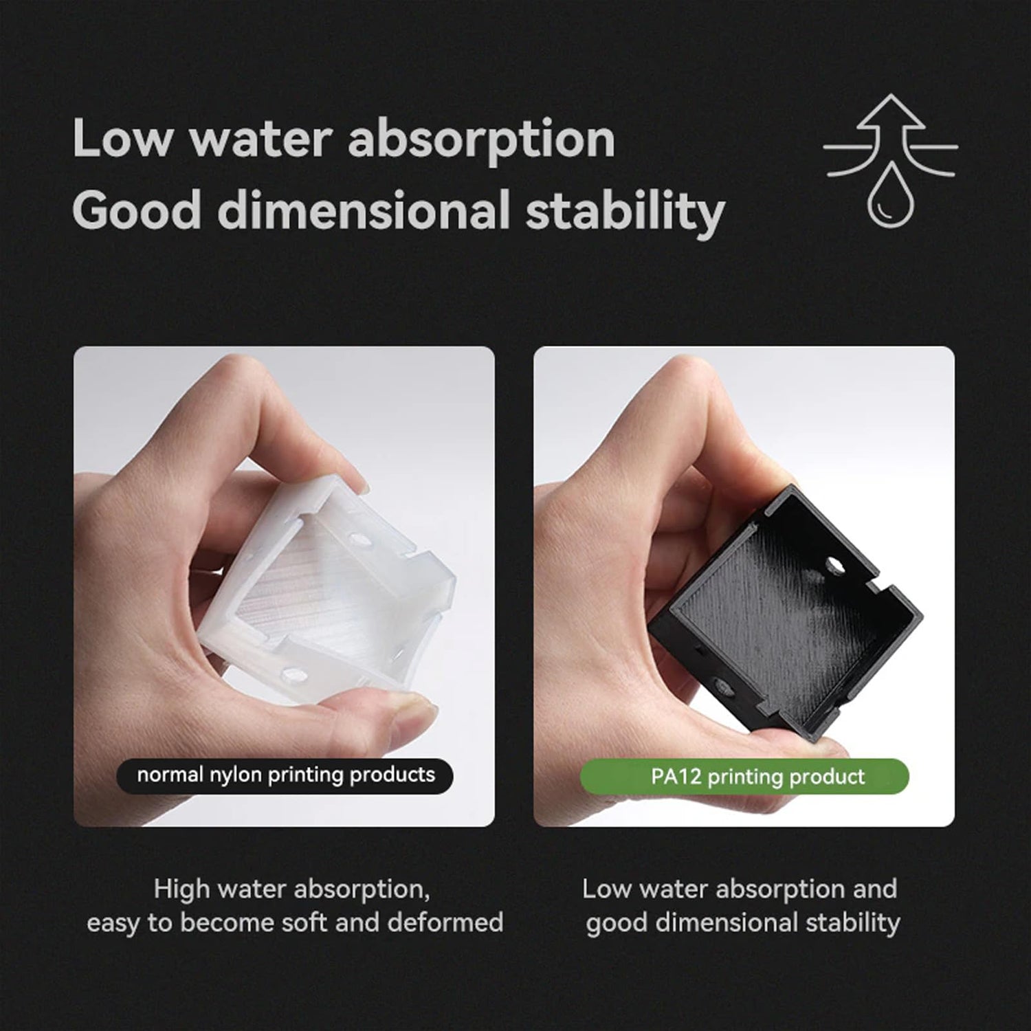 - Low water absorption: Compared with standard PA6, PA12 has lower water absorption efficiency, and the mechanical properties of printed parts are less affected after water absorption, which ensures the performance of printed parts.