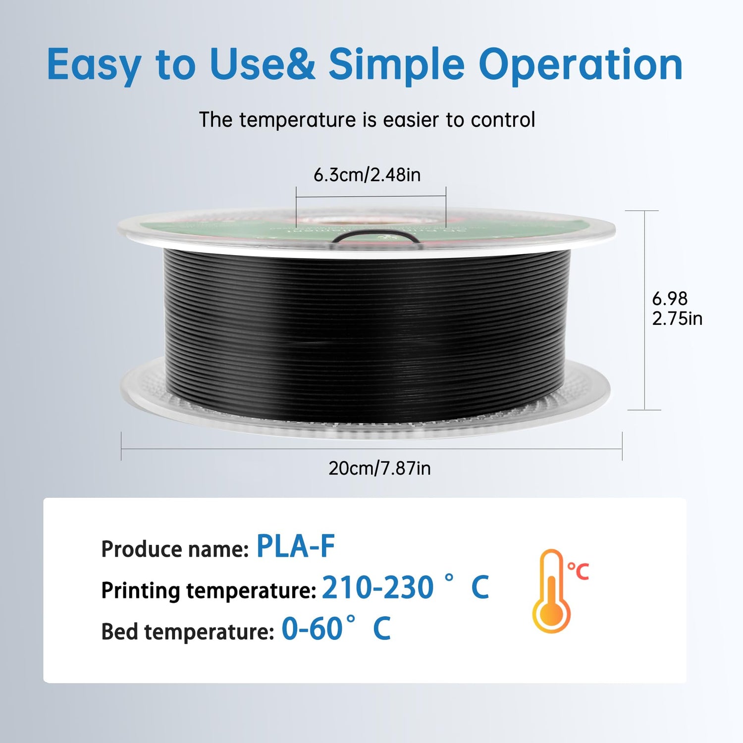 - SMOOTH PRINTING: The PLA-F plus filament is manufactured with precision, maintaining a diameter accuracy of 1.75mm ± 0.03mm. The neatly wound spools prevent tangling, allowing for a seamless printing experience without clogging or interruptions. Enjoy a hassle-free printing process from start to finish.