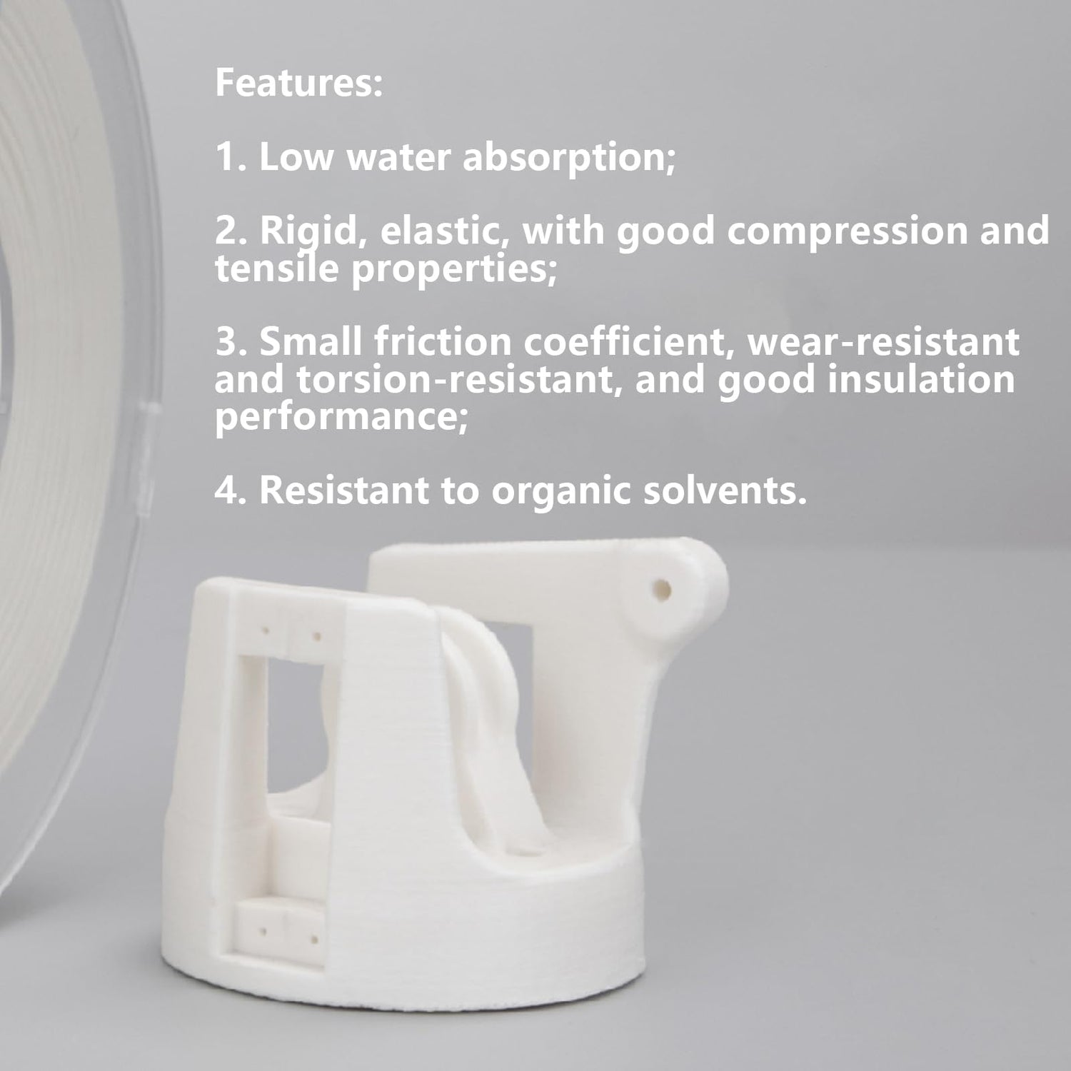 POM filaments have high stiffness, mechanical impact strength, and fatigue strength. It also has excellent self-lubricating properties and wear resistance, and is used for mechanical parts.