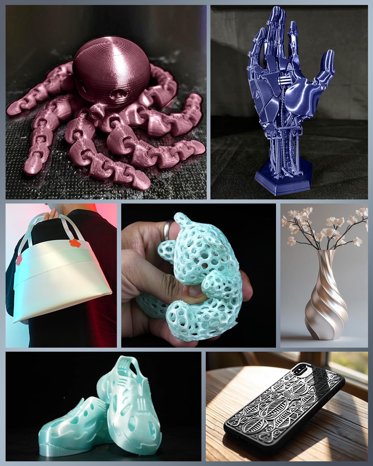 - Wide Application: 98A TPU-SILK 3D filament suitable for printing high impact resistance models, flexible functional parts, and decorative items