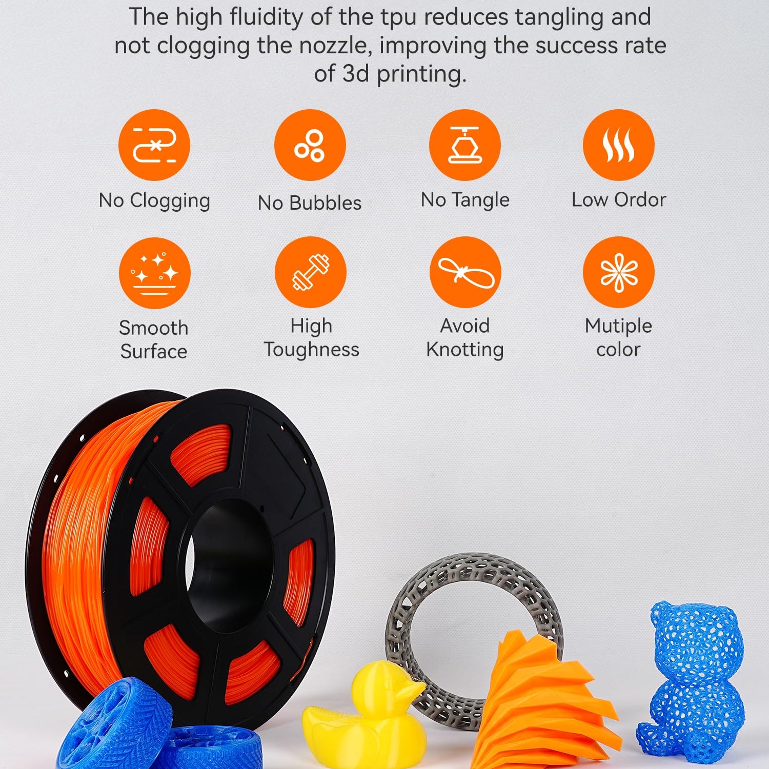- CLOG-FREE & BUBBLE-FREE - Vacuum-sealed packing with desiccant prevent tpu filament from moisture and dust, which guarantee a smooth and seamless printing.
