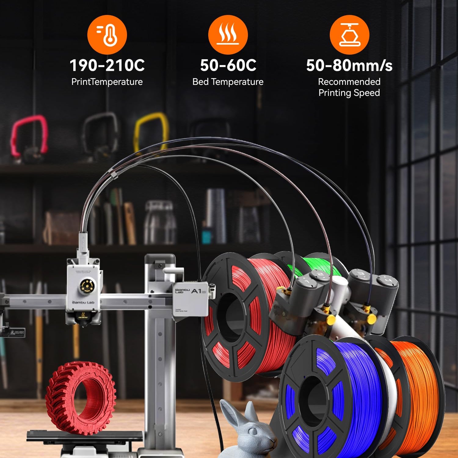 - TPU PRINTING SETTING - Recommend printing at a nozzle temperature of 210-230°C (410°F - 446°F), bed temperature of 50-60°C (122°F - 140°F), printing speed of 80-120mm/s.
