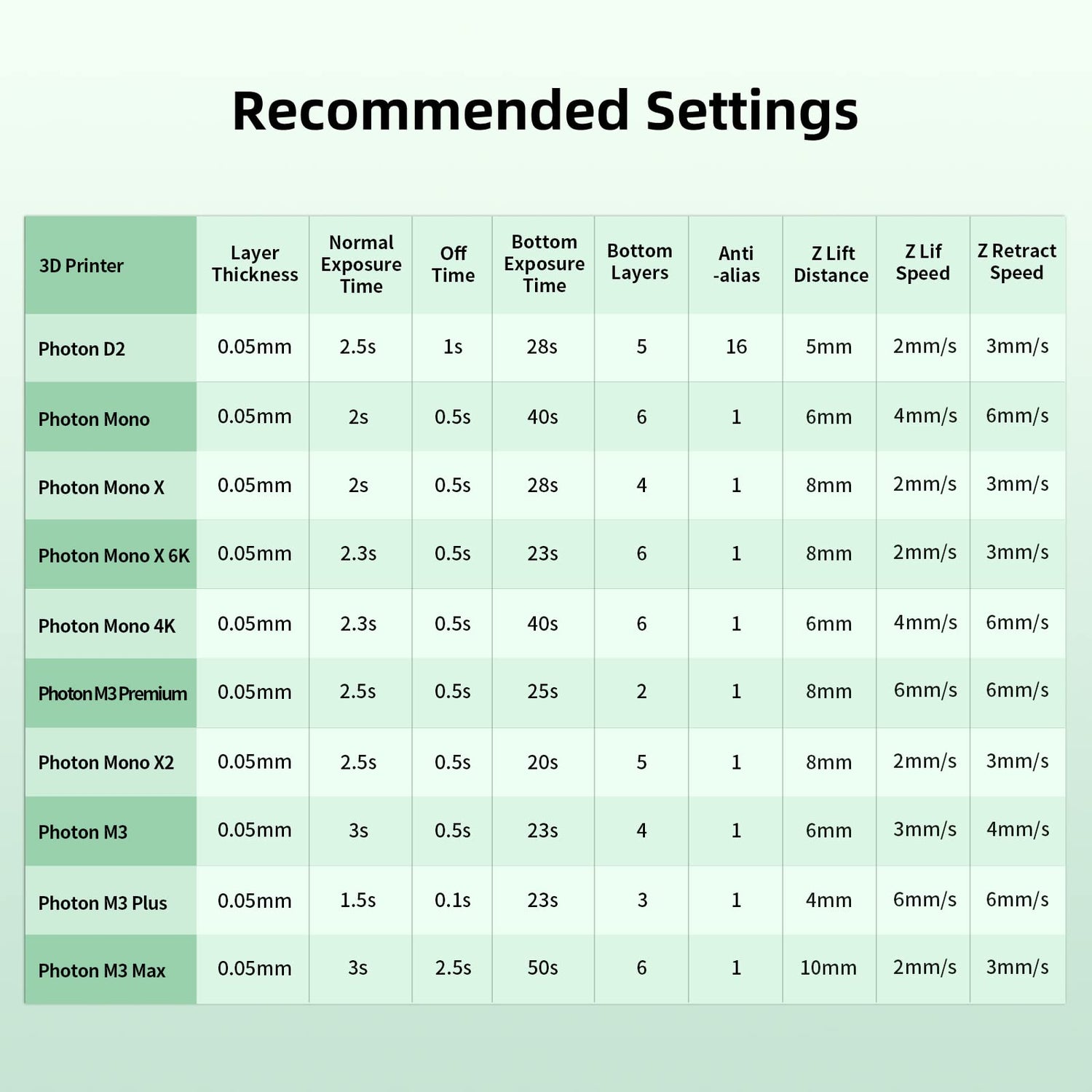 - 【Fast Curing & Exposure Time】 Optimized curing time for Anycubic Photon, offering better printing quality. Bottom layer exposure: 60-80s; Normal exposure: 8-10s.