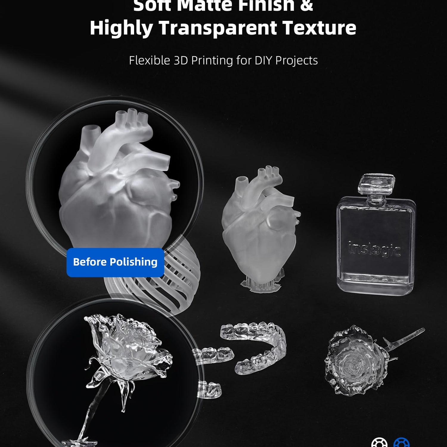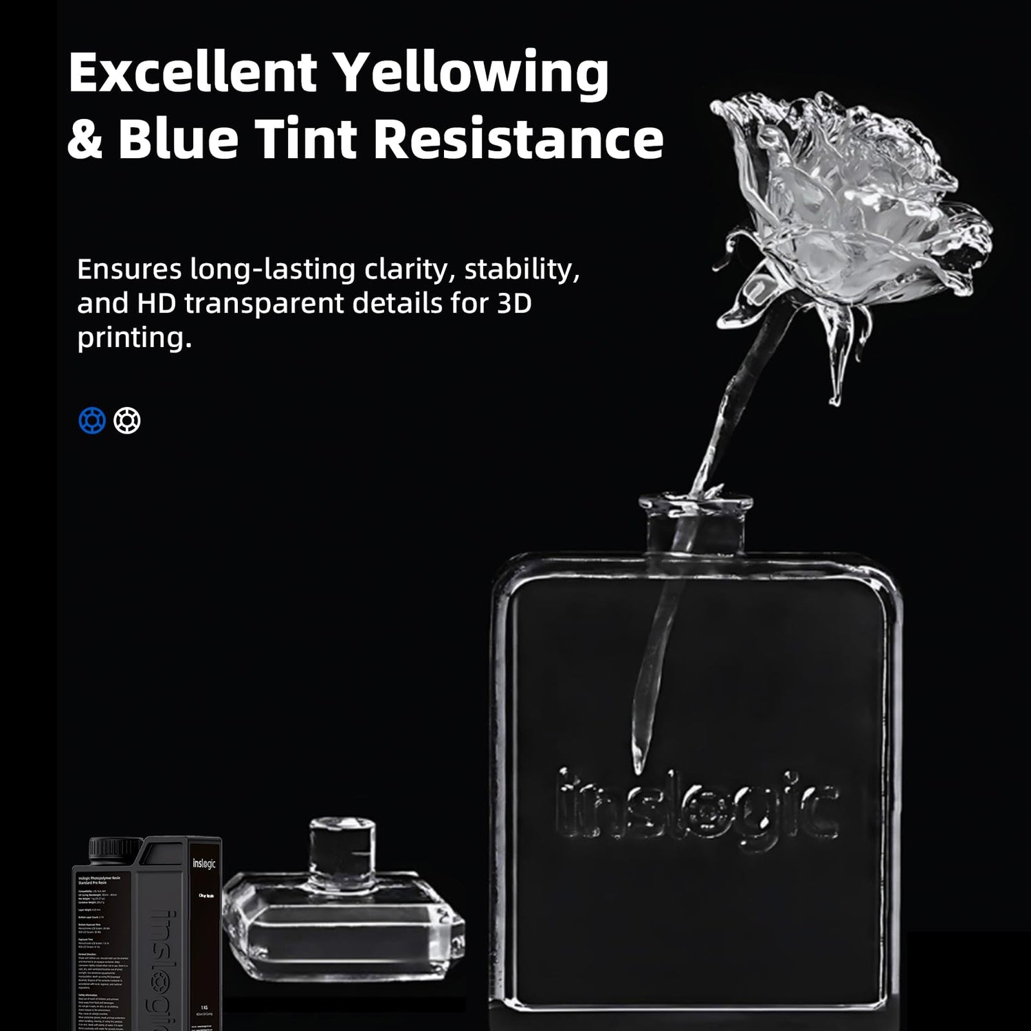 • 【Excellent Yellowing & Blue Tint Resistance】 3D prints made with Inslogic Clear Resin are resistant to yellowing and cracking over time, maintaining long-lasting clarity, stability, and HD transparent details.