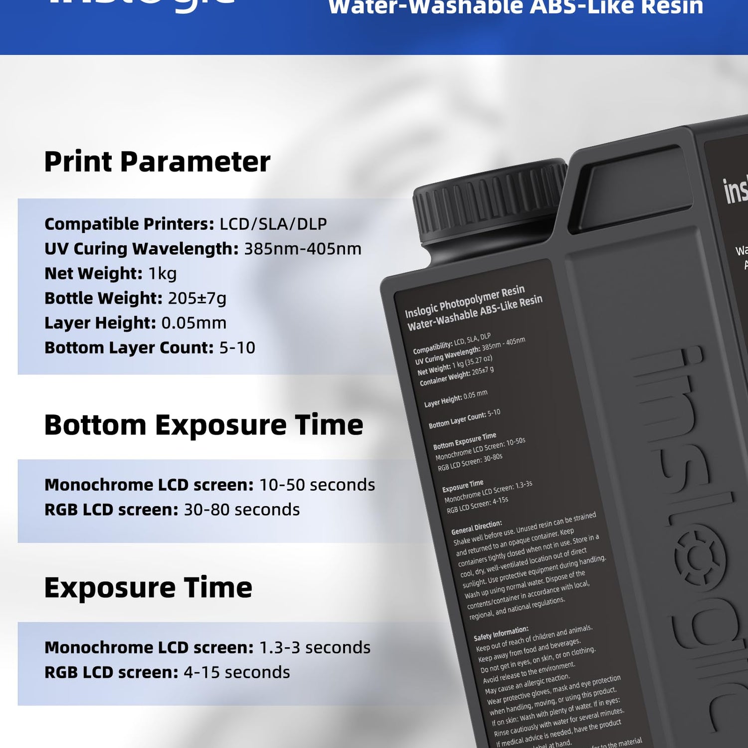 Inslogic Water-Washable ABS-Like Resin, Combines Features of ABSLIKE Resin & Water Washable Resin, Non Brittle, High Precision, Fast Curing 3D Resin for LCD DLP SLA 3D Printers, 1KG Grey