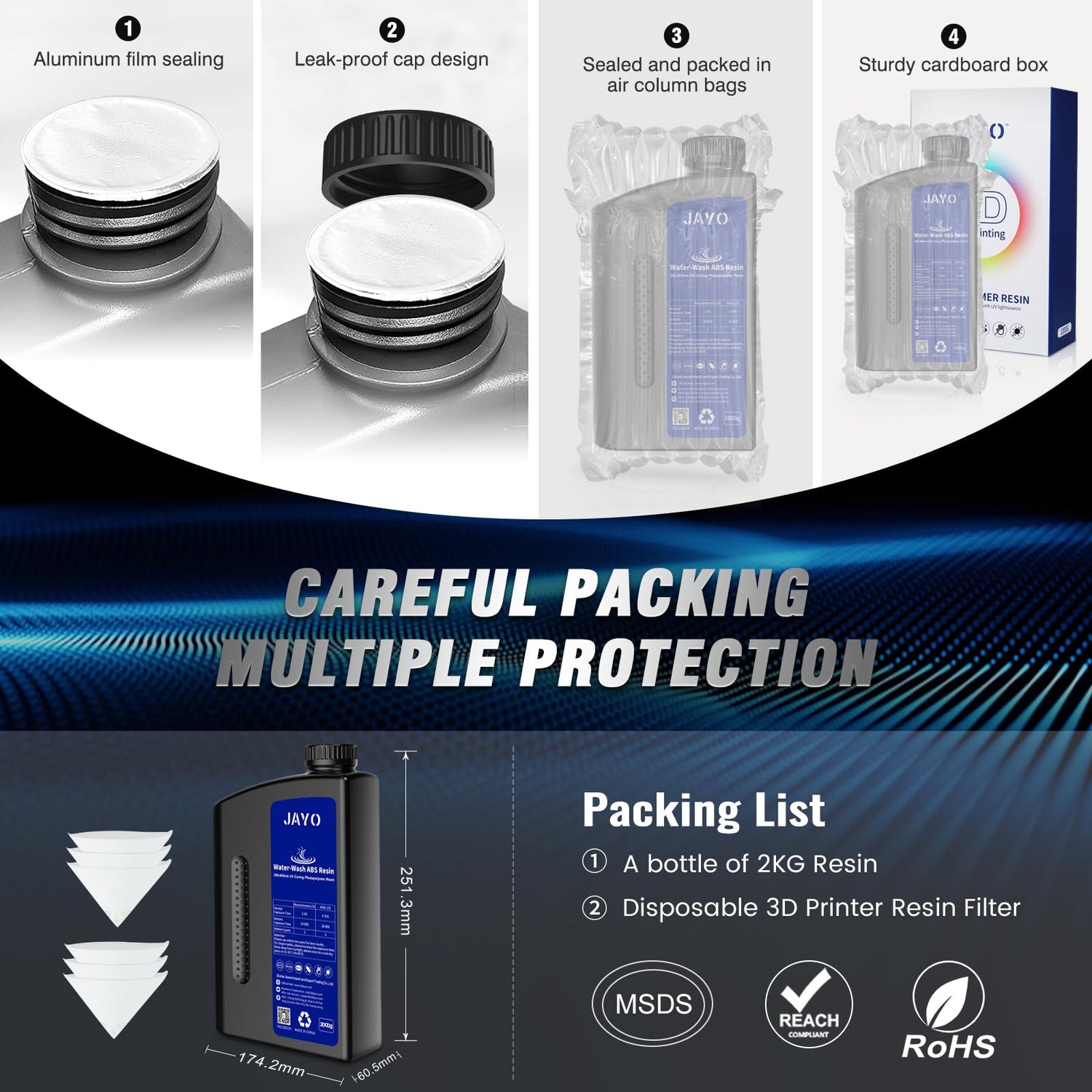 - 【Leakproof & Professional Packaging】JAYO resin bottle mouth is sealed with aluminum foil, and have a patented leak-proof design of the bottle cap. The bottles are wrapped in air column bags and packed into a hard cardboard box.