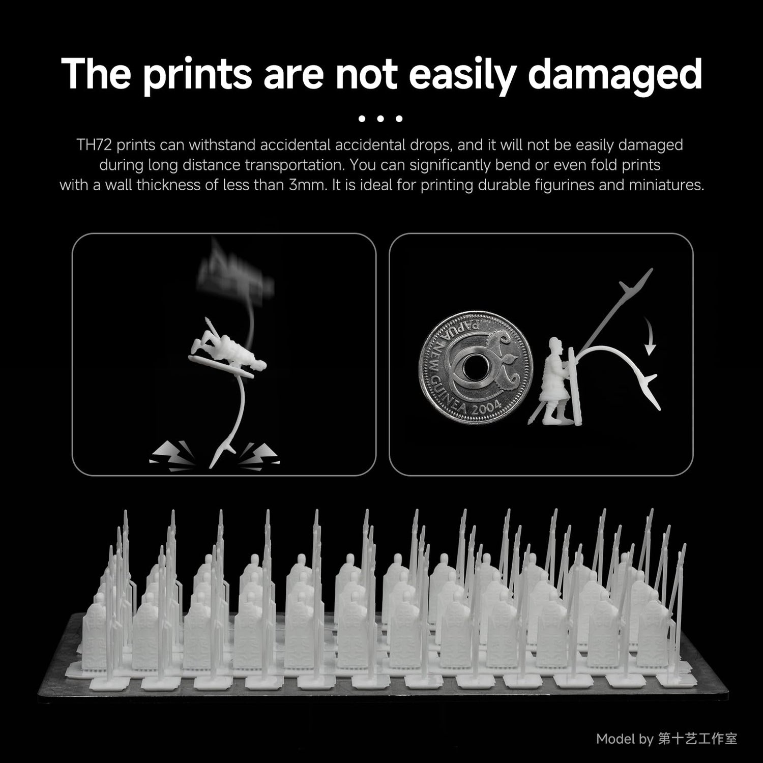 - The prints are not easily damaged: TH72 printer resin prints can withstand accidental accidental drops, and it will not be easily damaged during long distance transportation. You can significantly bend or even fold prints with a wall thickness of less than 3mm. It is ideal for printing durable figurines and miniatures