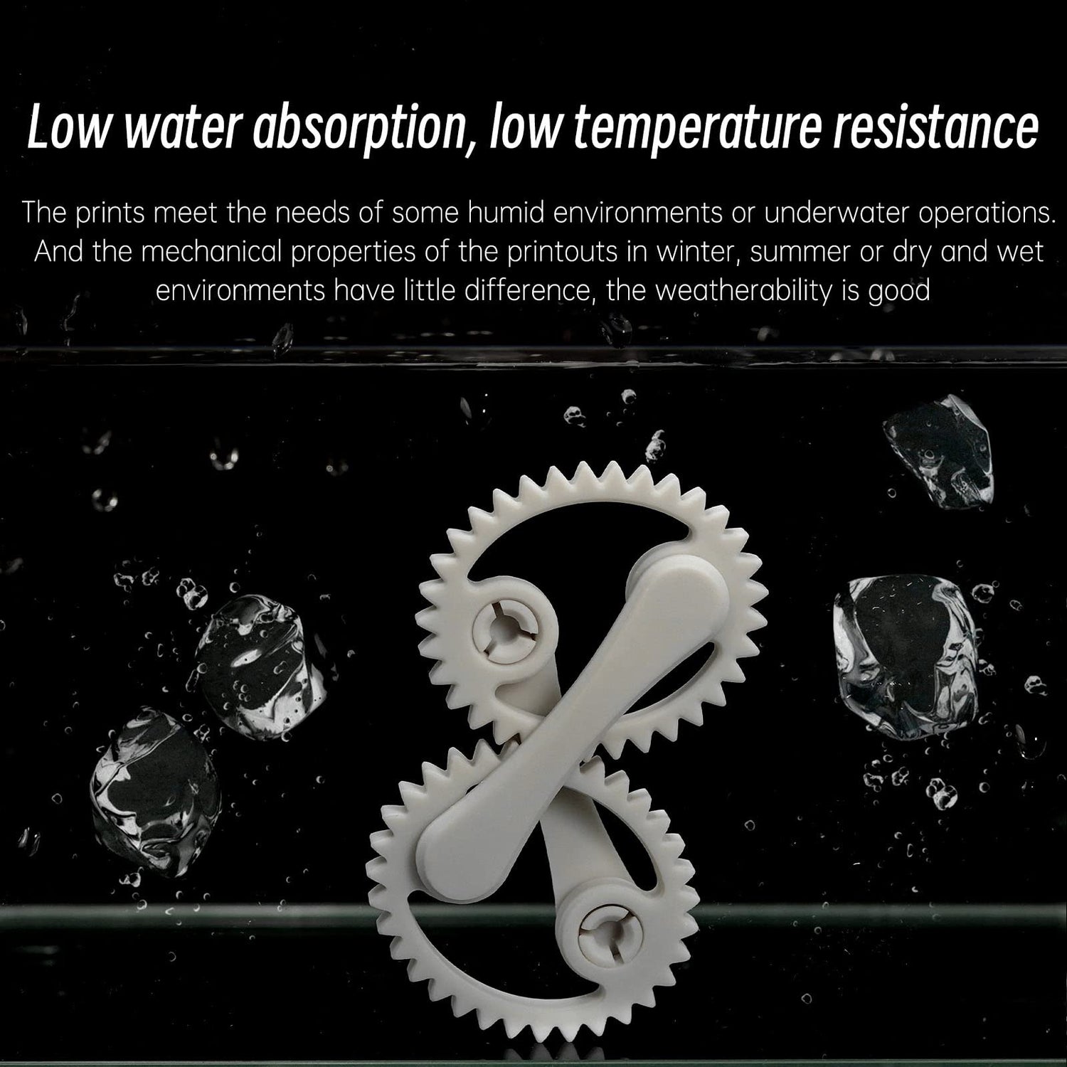 - Low water absorption, low-temperature resistance, good weatherability: The water absorption is as low as 0.46%, which can meet the needs of some humid environments or underwater operations. In addition, the mechanical properties of the printouts in winter, summer, or dry and wet environments have little difference, and the weatherability is good