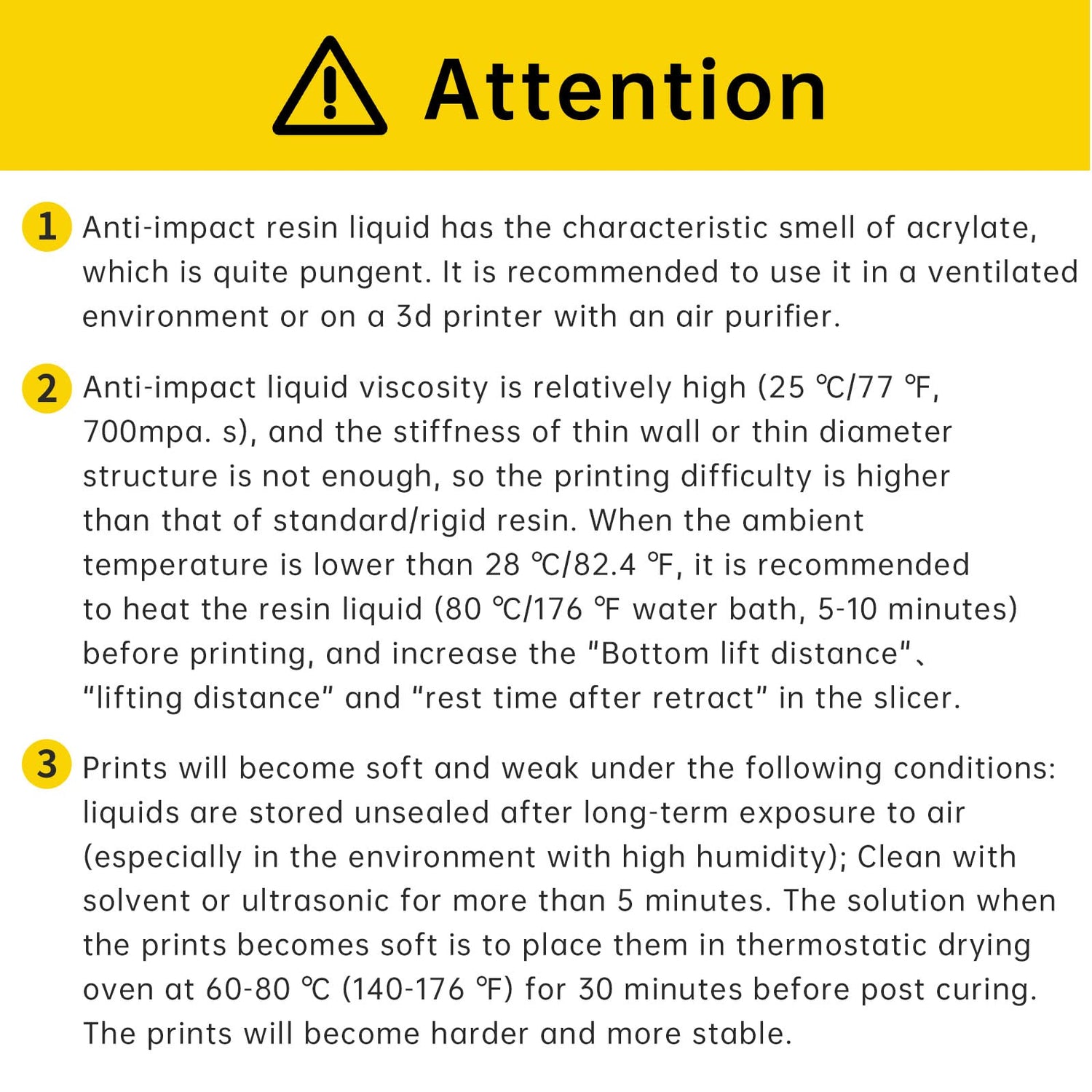 - Special smell, and not suitable for novices: Anti-impact 3D printing liquid has the characteristic smell of acrylate, which is quite pungent. Anti-impact liquid viscosity is relatively high (25 ℃/77 ℉, 700mpa. s), and the stiffness of thin wall or thin diameter structure is not enough, so the printing difficulty is higher than that of standard/rigid resin