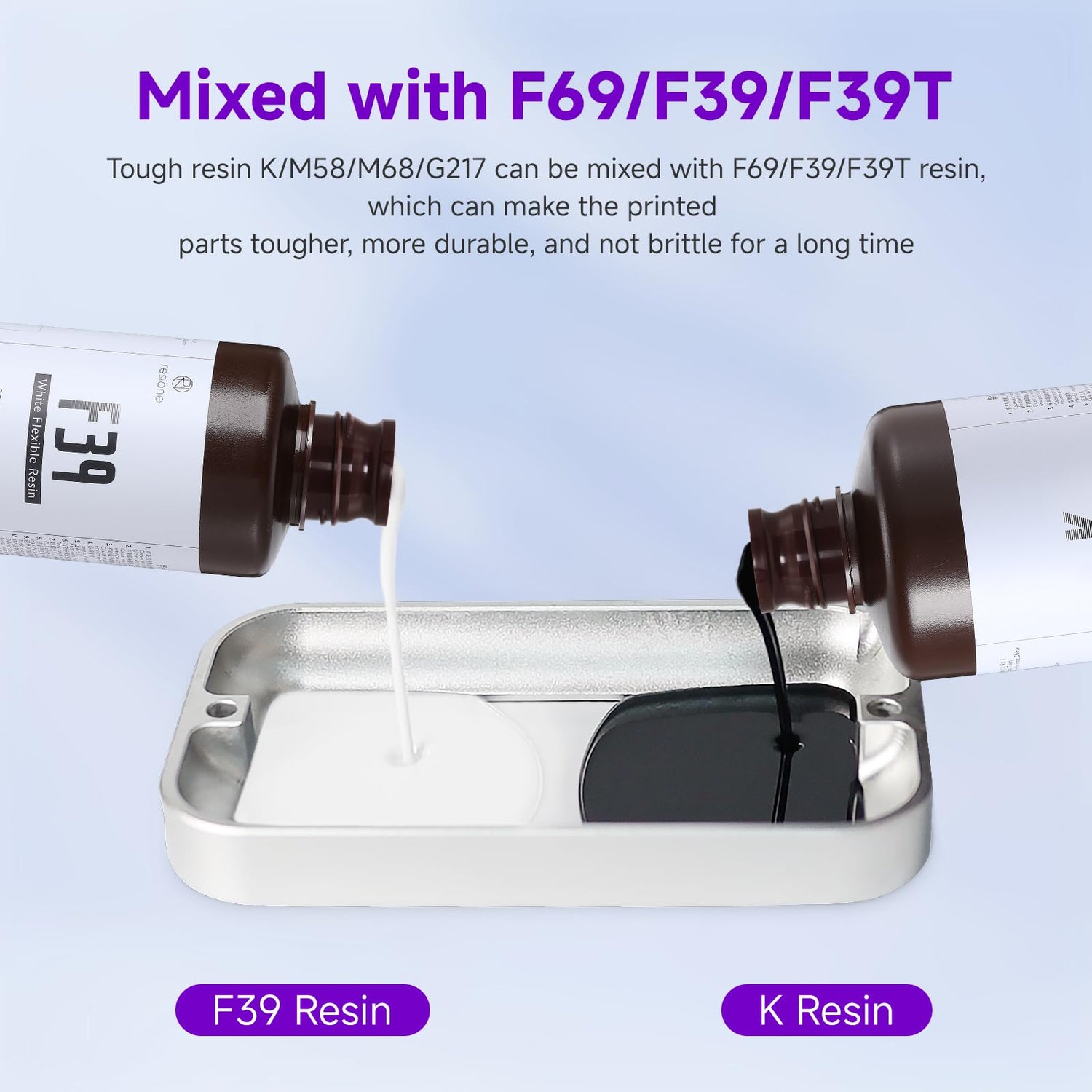 - Mixed with F69/F39/F39T: Tough resin K/M58/M68/G217 can be mixed with F69/F39/F39T resin, which can make the printed parts tougher, more durable, and not brittle for a long time