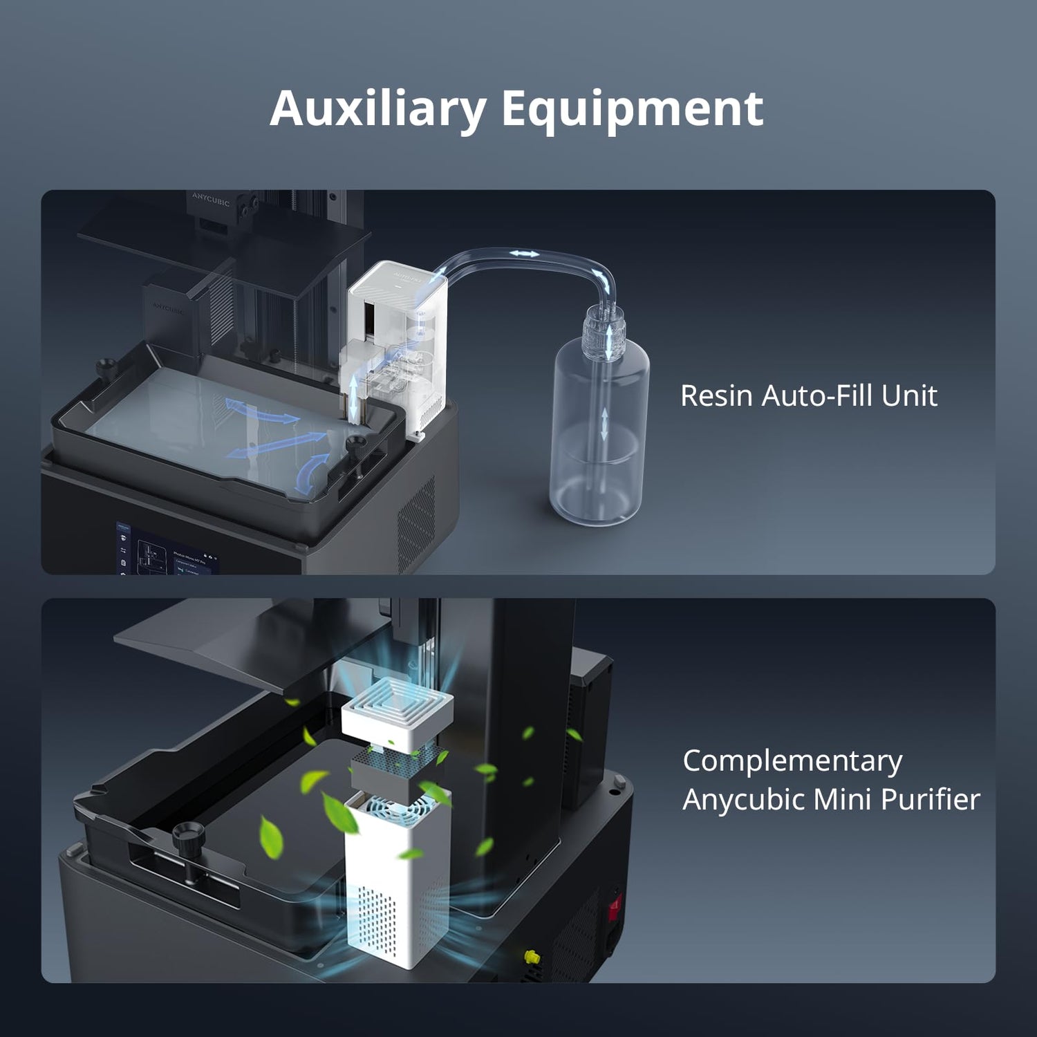 - 【Auxiliary Printing Equipments】Resin auto-fill unit supports auto resin refill and continuous refiling with printing, and one key recycling of remaining resin. Anycubic Airpure effectively absorbs and filters resin odors, providing a more comfortable printing experience.