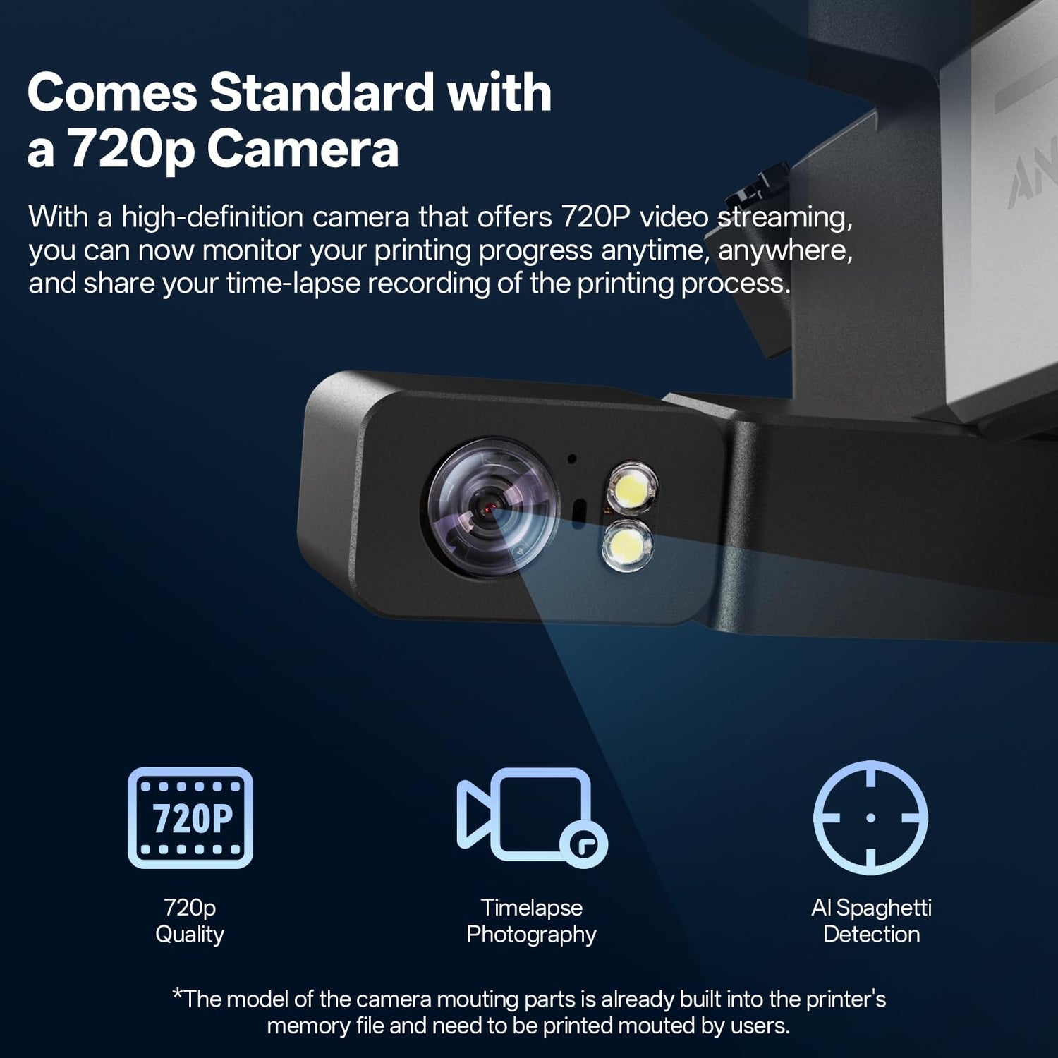 - 【Comes Standard with a 720p Camera】With a high-definition camera that offers 720P video streaming, you can now monitor your printing progress anytime, anywhere, and share your time-lapse recording of the printing process