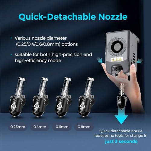 - ➡️Supports PLA, ABS, PETG, ASA, TPU, PC, PLA-CF, and PETG-CF materials. Choose from various nozzle diameter options (0.25/0.4/0.6/0.8 mm) for high precision or high efficiency modes. Whether you're a novice or an expert, maintenance is a breeze with this smart and efficient choice for all your creative projects.