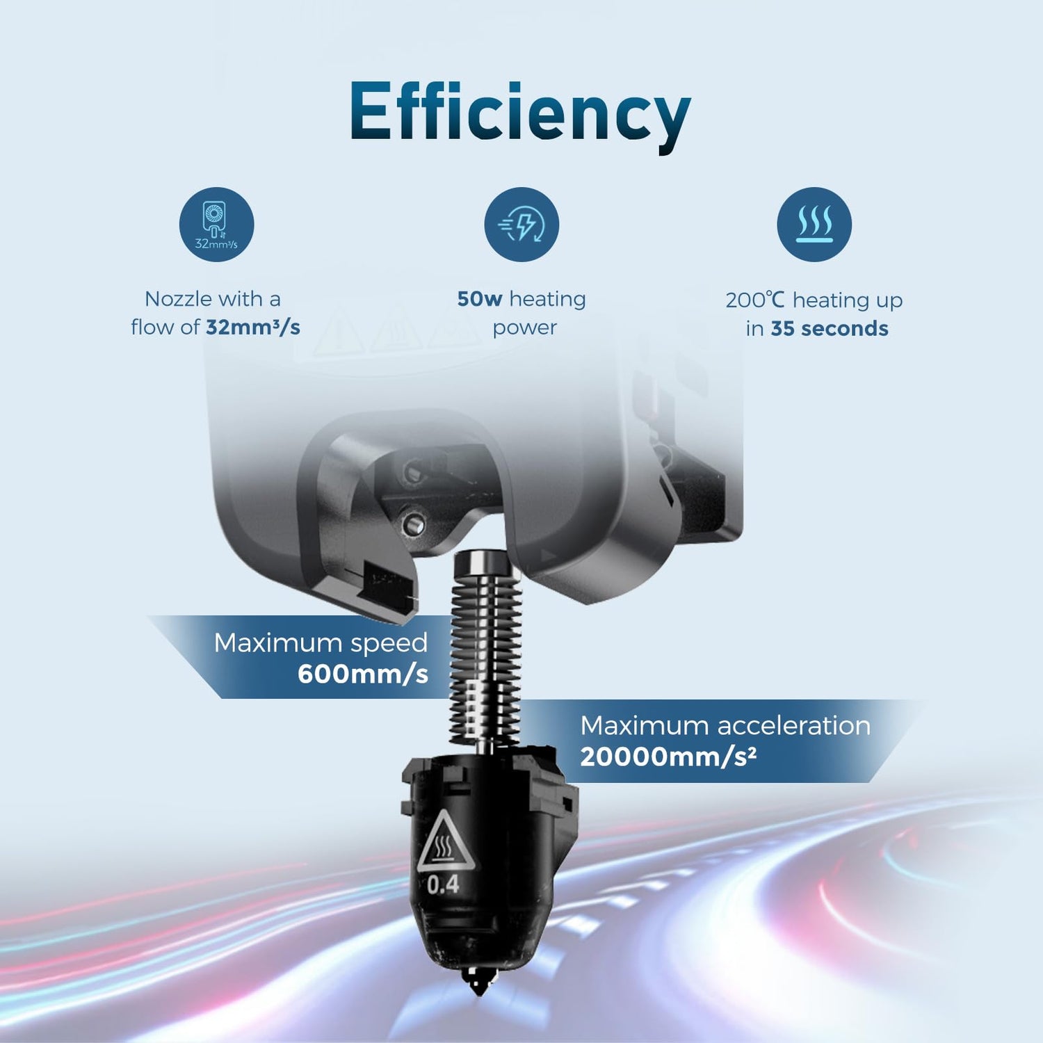 - Efficiency. Printing: Maximum speed 600mm/s, Maximum acceleration 20000mm/s². Less waiting time: Nozzle with a flow of 32mm³/s, 50w heating power, 200˚C heating up in 35 seconds.