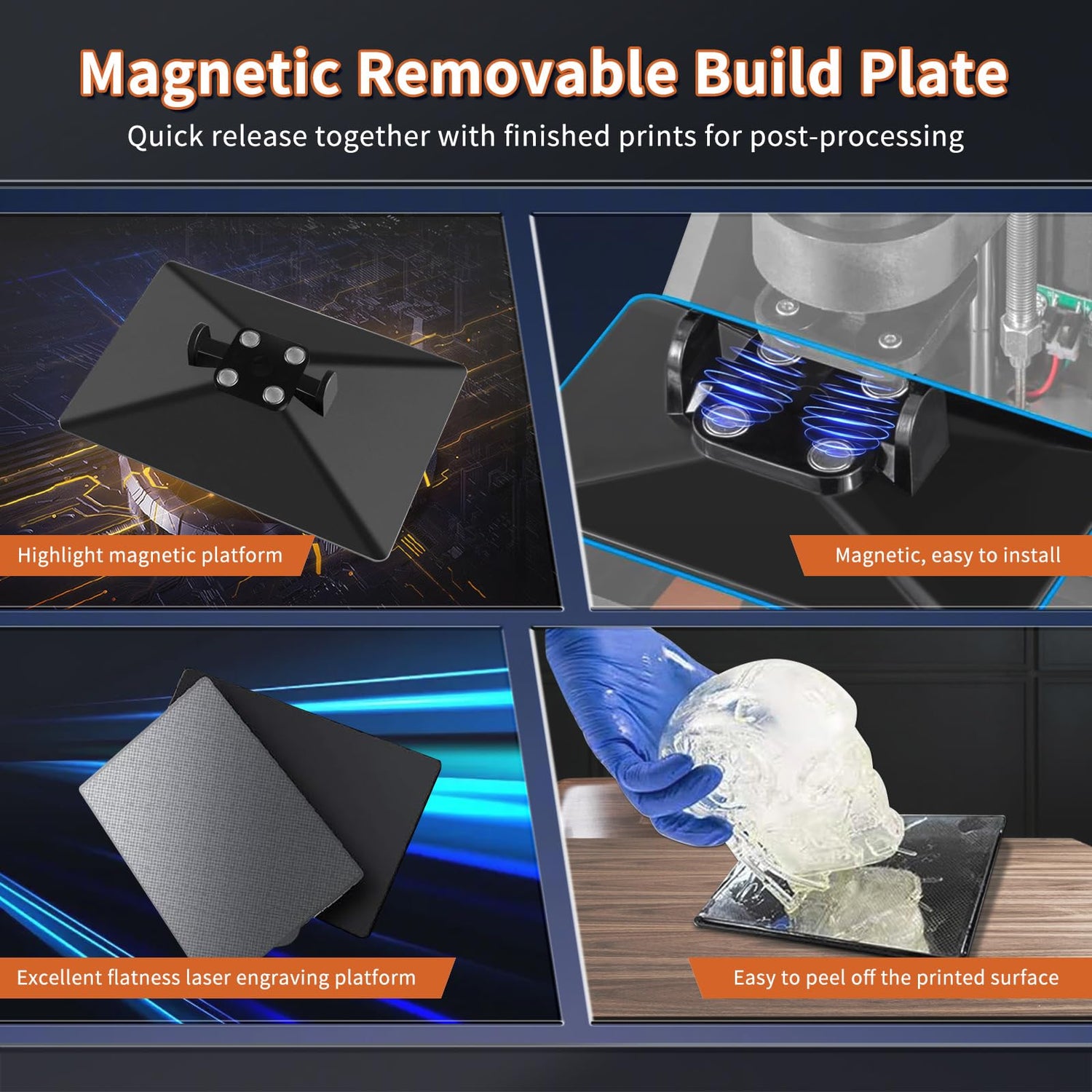 - 【Magnetic Build Plate】The magnetic build plate is easy to remove and takes the hassle out of cleaning and prepping for multiple print jobs in quick succession. The strong magnets hold the plate steady enabling the auto leveling system to be precise and perfectly balanced.