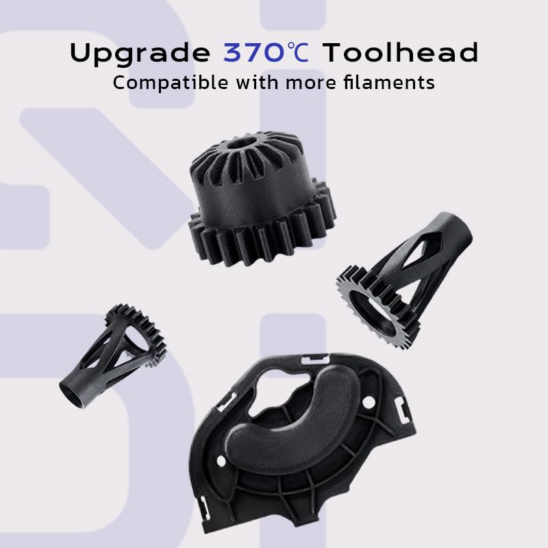 - High-temp printing & Multi-filament compatibility: The X-PLUS4 comes with an upgraded 80W high-temperature hotend and multi-metal integrated throat nozzle, nozzle can heat up to 370°C . Designed for faster installation and removal, it reduces clogging risks and offers exceptional wear resistance. This setup unlock high-performance filaments such as PPS-CF, PPA-CF/GF , and support normal filament, including ABS, ASA, PC, PA, PETG, PLA and more.