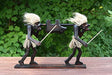 Details: This primitive style sculpture features two rugged hunter returning with their prize catch ready to feast with the tribe. Hand carved from teak wood, this figurine also feature jute hair and burlap loincloths on the hunters. A very unique and interesting wood sculpture for your home.