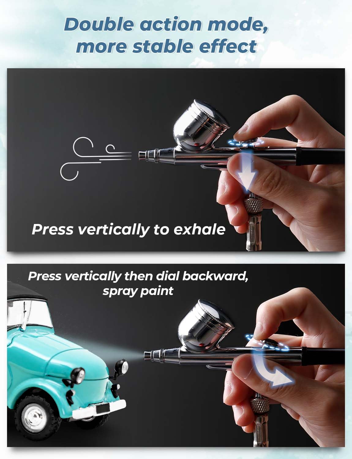 • Dual-action Airbrush Gun, Flexible Operation: Press for air, pull back for paint, allowing precise control over spray volume and range by rotating the screw at the tail
